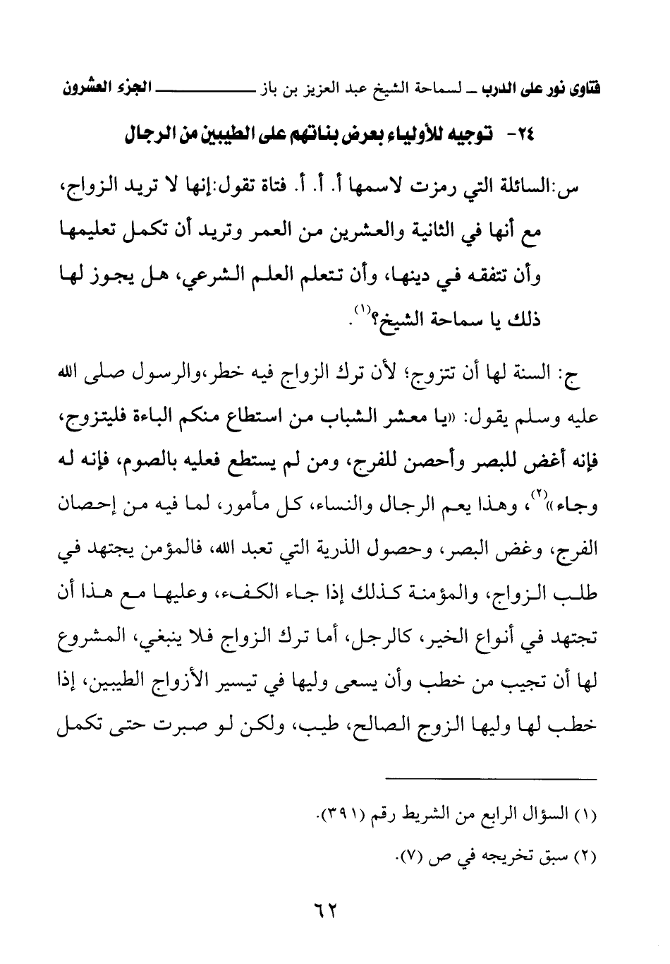 ج: السنة لها أن تتزوج؛ لأن ترك الزواج فيه خطر، والرسول صلى الله عليه وسلم يقول: «يا معشر الشباب من استطاع منكم الباءة فليتزوج، فإنه أغض للبصر وأحصن للفرج، ومن لم يستطع فعليه بالصوم، فإنه له وجاء» (¬2) وهذا يعم الرجال والنساء، كل مأمور، لما فيه من إحصان الفرج، وغض البصر، وحصول الذرية التي تعبد الله، فالمؤمن يجتهد في طلب الزواج، والمؤمنة كذلك إذا جاء الكفء، وعليها مع هذا أن تجتهد في أنواع الخير، كالرجل، أما ترك الزواج فلا ينبغي، المشروع لها أن تجيب من خطب وأن يسعى وليها في تيسير الأزواج الطيبين، إذا خطب لها وليها الزوج الصالح، طيب، ولكن لو صبرت حتى تكمل