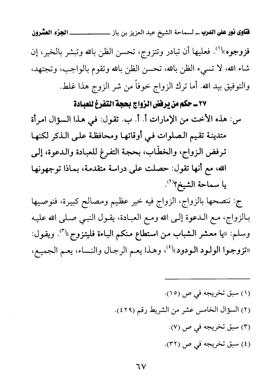 27 - حكم من يرفض الزواج بحجة التفرغ للعبادة