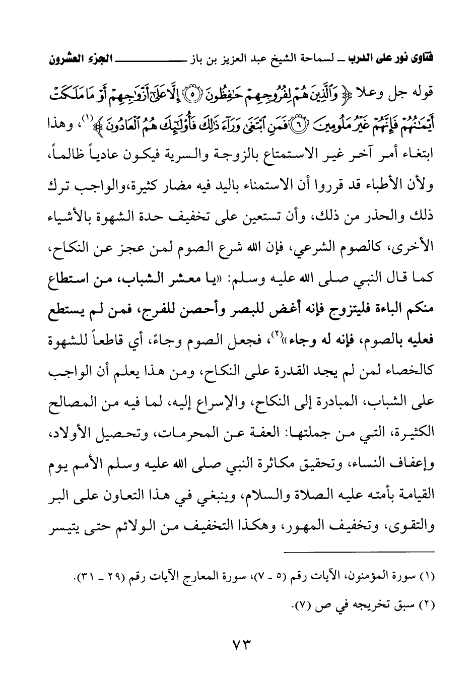 قوله جل وعلا: {وَالَّذِينَ هُمْ لِفُرُوجِهِمْ حَافِظُونَ (5) إِلا عَلَى أَزْوَاجِهِمْ أوْ مَا مَلَكَتْ أَيْمَانُهُمْ فَإِنَّهُمْ غَيْرُ مَلُومِينَ (6) فَمَنِ ابْتَغَى وَرَاءَ ذَلِكَ فَأُولَئِكَ هُمُ الْعَادُونَ}، وهذا ابتغاء أمر آخر غير الاستمتاع بالزوجة والسرية فيكون عاديًا ظالمًا، ولأن الأطباء قد قرروا أن الاستمناء باليد فيه مضار كثيرة، والواجب ترك ذلك والحذر من ذلك، وأن تستعين على تخفيف حدة الشهوة بالأشياء الأخرى، كالصوم الشرعي، فإن الله شرع الصوم لمن عجز عن النكاح، كما قال النبي صلى الله عليه وسلم: «يا معشر الشباب، من استطاع منكم الباءة فليتزوج فإنه أغض للبصر وأحصن للفرج، فمن لم يستطع فعليه بالصوم، فإنه له وجاء» (¬1) فجعل الصوم وجاءً، أي قاطعًا للشهوة كالخصاء لمن لم يجد القدرة على النكاح، ومن هذا يُعلم أن الواجب على الشباب المبادرة إلى النكاح والإسراع إليه، لما فيه من المصالح الكثيرة، التي من جملتها: العفة عن المحرمات، وتحصيل الأولاد، وإعفاف النساء، وتحقيق مكاثرة النبي صلى الله عليه وسلم الأمم يوم القيامة بأمته عليه الصلاة والسلام، وينبغي في هذا التعاون على البر والتقوى، وتخفيف المهور، وهكذا التخفيف من الولائم حتى يتيسر