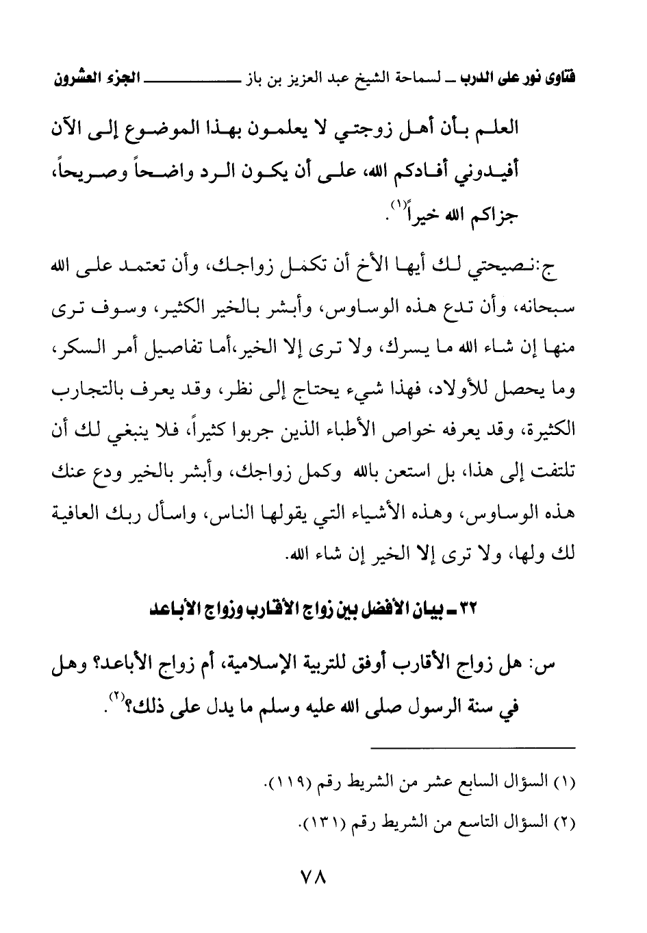 ج: نصيحتي لك أيها الأخ أن تكمل زواجك، وأن تعتمد على الله سبحانه، وأن تدع هذه الوساوس، وأبشر بالخير الكثير، وسوف ترى منها إن شاء الله ما يسرك، ولا ترى إلا الخير، أما تفاصيل أمر السكر، وما يحصل للأولاد، فهذا شيء يحتاج إلى نظر، وقد يعرف بالتجارب الكثيرة، وقد يعرفه خواص الأطباء الذين جربوا كثيرًا، فلا ينبغي لك أن تلتفت إلى هذا، بل استعن بالله وكمل زواجك، وأبشر بالخير ودع عنك هذه الوساوس، وهذه الأشياء التي يقولها الناس، واسأل ربك العافية لك ولها، ولا ترى إلا الخير إن شاء الله.
