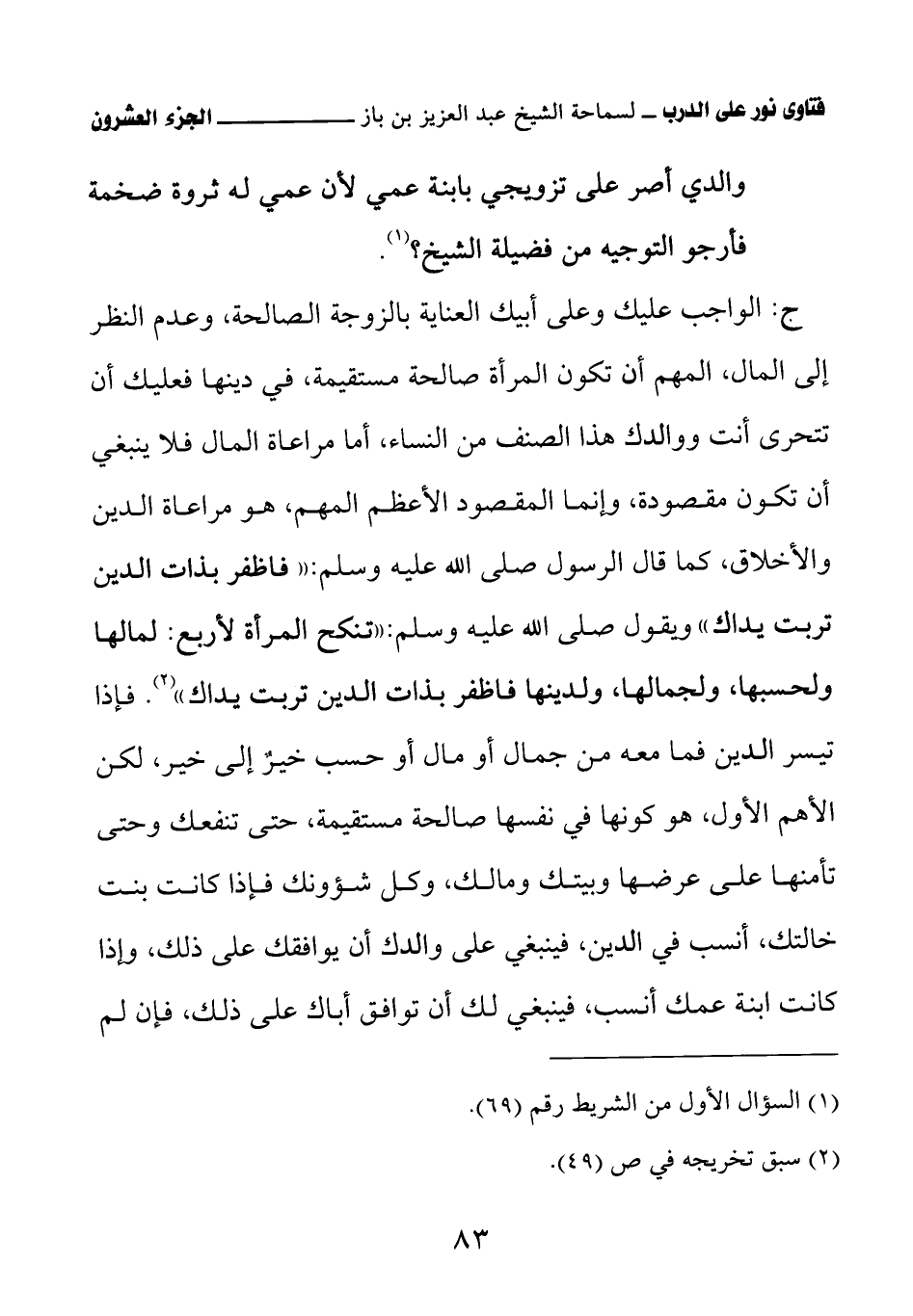 ج: الواجب عليك وعلى أبيك العناية بالزوجة الصالحة، وعدم النظر إلى المال، المهم أن تكون المرأة صالحة مستقيمة، في دينها فعليك أن تتحرى أنت ووالدك هذا الصنف من النساء، أما مراعاة المال فلا ينبغي أن تكون مقصودة، وإنما المقصود الأعظم المهم، هو مراعاة الدين والأخلاق، كما قال الرسول صلى الله عليه وسلم: «فاظفر بذات الدين تربت يداك» (¬2) ويقول صلى الله عليه وسلم: «تنكح المرأة لأربع: لمالها ولحسبها، ولجمالها، ولدينها فاظفر بذات الدين تربت يداك» (¬3) فإذا تيسر الدين فما معه من جمال أو مال أو حسب خيرٌ إلى خير، لكن الأهم الأول، هو كونها في نفسها صالحة مستقيمة، حتى تنفعك وحتى تأمنها على عرضها وبيتك ومالك، وكل شؤونك فإذا كانت بنت خالتك، أنسب في الدين، فينبغي على والدك أن يوافقك على ذلك، وإذا كانت ابنة عمك أنسب، فينبغي لك أن توافق أباك على ذلك، فإن لم