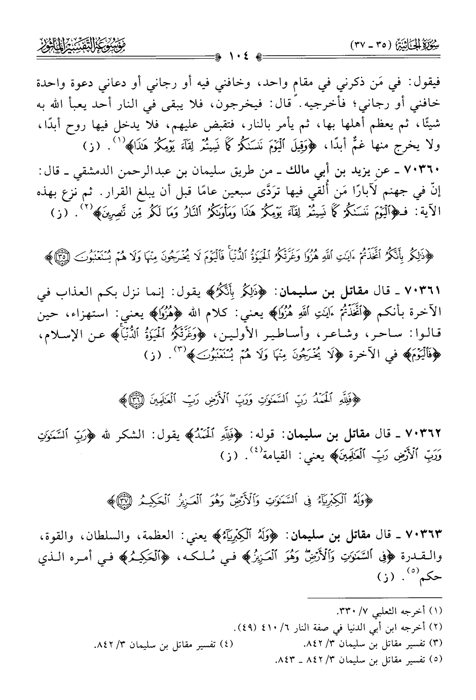 ٧٠٣٦١ - قال مقاتل بن سليمان: {ذلِكُمْ بِأَنَّكُمُ} يقول: إنما نزل بكم العذاب في الآخرة بأنكم {اتَّخَذْتُمْ آياتِ اللَّهِ} يعني: كلام الله {هُزُوًا} يعني: استهزاء، حين قالوا: ساحر، وشاعر، وأساطير الأولين، {وغَرَّتْكُمُ الحَياةُ الدُّنْيا} عن الإسلام، {فاليَوْمَ} في الآخرة {لا يُخْرَجُونَ مِنها ولا هُمْ يُسْتَعْتَبُونَ} (¬٣). (ز)