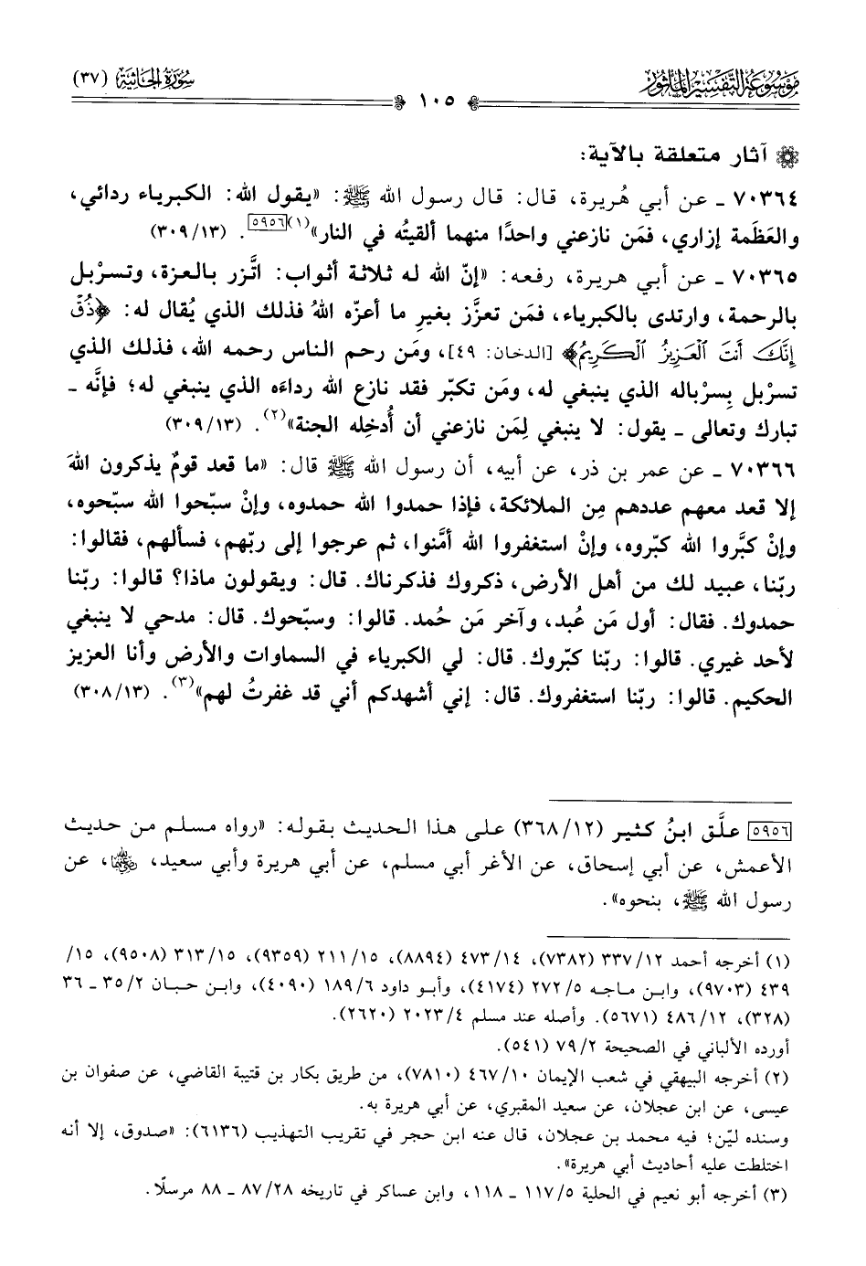 ٧٠٣٦٥ - عن أبي هريرة، رفعه: «إنّ الله له ثلاثة أثواب: اتَّزر بالعزة، وتسرْبل بالرحمة، وارتدى بالكبرياء، فمَن تعزَّز بغيرِ ما أعزّه اللهُ فذلك الذي يُقال له: {ذُقْ إنَّكَ أنْتَ العَزِيزُ الكَرِيمُ} [الدخان: ٤٩]، ومَن رحم الناس رحمه الله، فذلك الذي تسرْبل بِسرْباله الذي ينبغي له، ومَن تكبّر فقد نازع الله رداءَه الذي ينبغي له؛ فإنّه -تبارك وتعالى- يقول: لا ينبغي لِمَن نازعني أن أُدخِله الجنة» (¬٢). (١٣/ ٣٠٩)