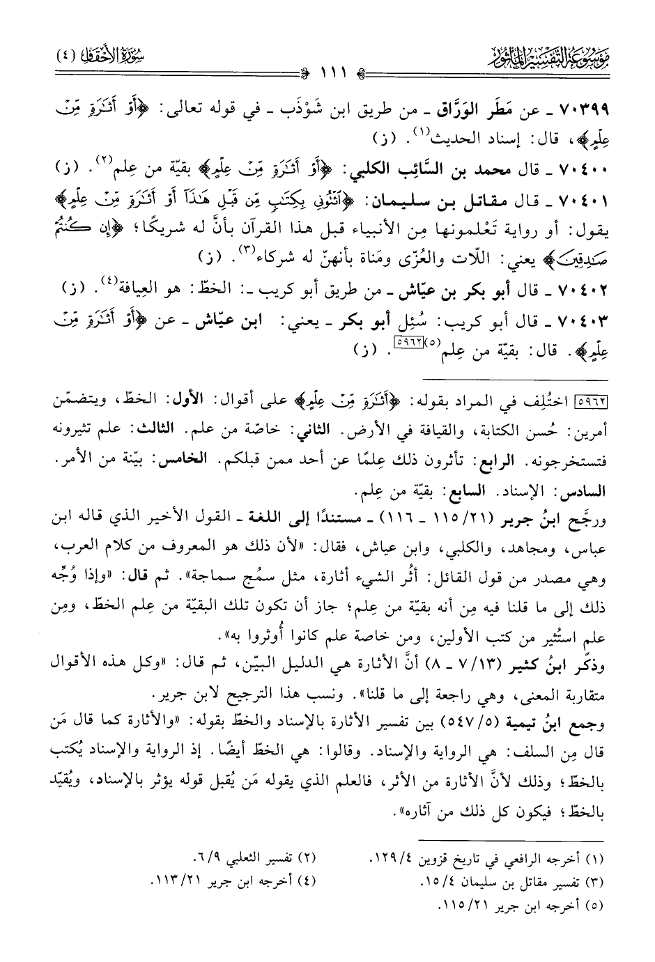 [٥٩٦٢] اختُلِف في المراد بقوله: {أثارة من علم} على أقوال: الأول: الخطّ، ويتضمّن أمرين: حُسن الكتابة، والقيافة في الأرض. الثاني: خاصّة من علم. الثالث: علم تثيرونه فتستخرجونه. الرابع: تأثرون ذلك عِلمًا عن أحد ممن قبلكم. الخامس: بيّنة من الأمر. السادس: الإسناد. السابع: بقيّة من عِلم.