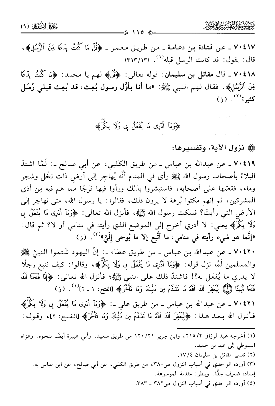 ٧٠٤٢١ - عن عبد الله بن عباس -من طريق علي-: {وما أدْرِي ما يُفْعَلُ بِي ولا بِكُمْ} فأنزل الله بعد هذا: {لِيَغْفِرَ لَكَ اللَّهُ ما تَقَدَّمَ مِن ذَنْبِكَ وما تَأَخَّرَ} [الفتح: ٢]، وقوله: