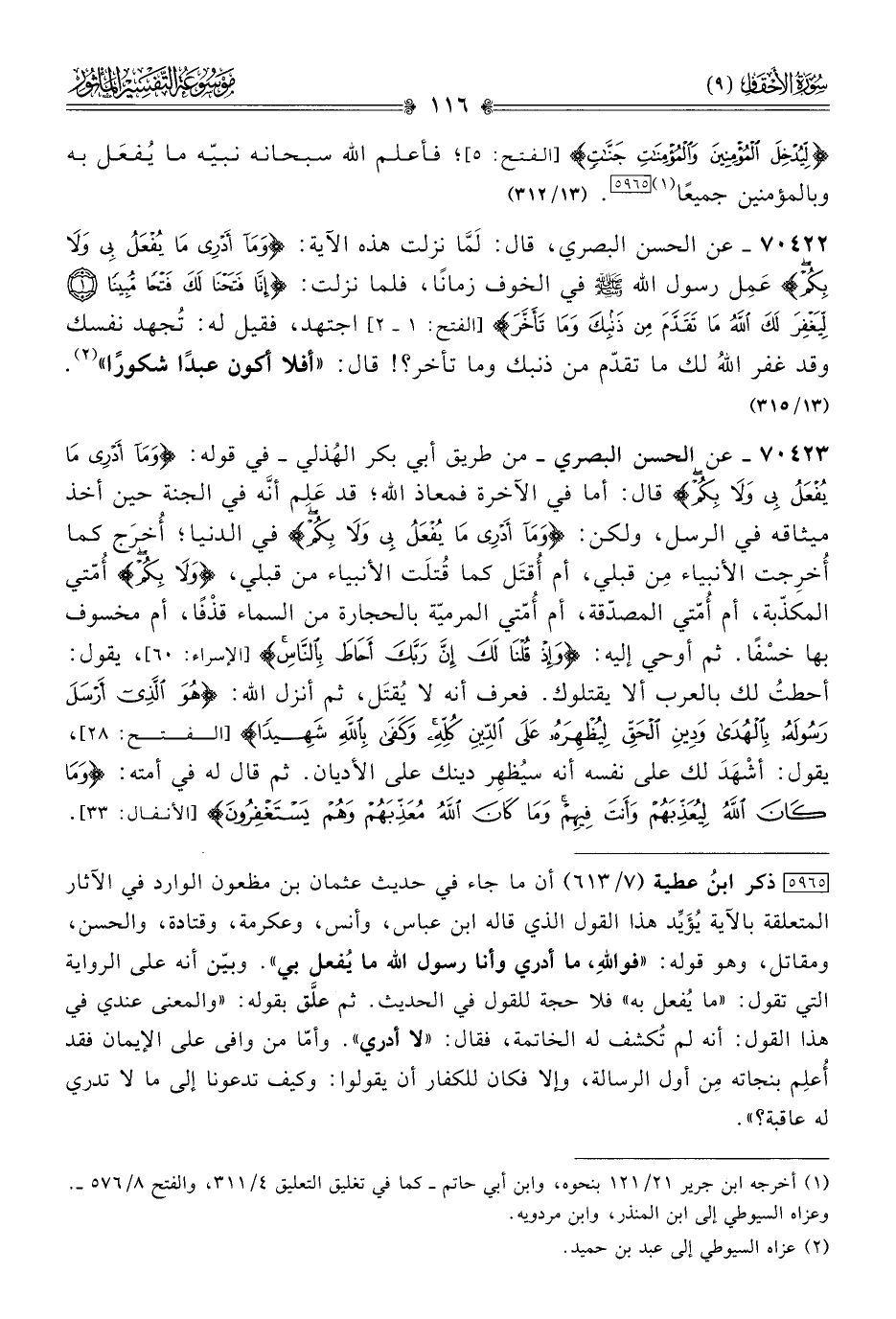 ٧٠٤٢٣ - عن الحسن البصري -من طريق أبي بكر الهُذلي- في قوله: {وما أدْرِي ما يُفْعَلُ بِي ولا بِكُمْ} قال: أما في الآخرة فمعاذ الله؛ قد عَلِم أنّه في الجنة حين أخذ ميثاقه في الرسل، ولكن: {وما أدْرِي ما يُفْعَلُ بِي ولا بِكُمْ} في الدنيا؛ أُخرَج كما أُخرِجت الأنبياء مِن قبلي، أم أُقتَل كما قُتلَت الأنبياء من قبلي، {ولا بِكُمْ} أُمّتي المكذّبة، أم أُمّتي المصدّقة، أم أُمّتي المرميّة بالحجارة من السماء قذْفًا، أم مخسوف بها خسْفًا. ثم أوحي إليه: {وإذْ قُلْنا لَكَ إنَّ رَبَّكَ أحاطَ بِالنّاسِ} [الإسراء: ٦٠]، يقول: أحطتُ لك بالعرب ألا يقتلوك. فعرف أنه لا يُقتَل، ثم أنزل الله: {هُوَ الَّذِي أرْسَلَ رَسُولَهُ بِالهُدى ودِينِ الحَقِّ لِيُظْهِرَهُ عَلى الدِّينِ كُلِّهِ وكَفى بِاللَّهِ شَهِيدًا} [الفتح: ٢٨]، يقول: أشْهَدَ لك على نفسه أنه سيُظهِر دينك على الأديان. ثم قال له في أمته: {وما كانَ اللَّهُ لِيُعَذِّبَهُمْ وأَنْتَ فِيهِمْ وما كانَ اللَّهُ مُعَذِّبَهُمْ وهُمْ يَسْتَغْفِرُونَ} [الأنفال: ٣٣].