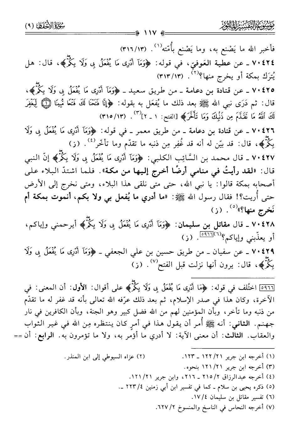 ٧٠٤٢٤ - عن عطية العَوفيّ، في قوله: {وما أدْرِي ما يُفْعَلُ بِي ولا بِكُمْ}، قال: هل يُترَك بمكة أو يخرج منها؟ (¬٢). (١٣/ ٣١٣)