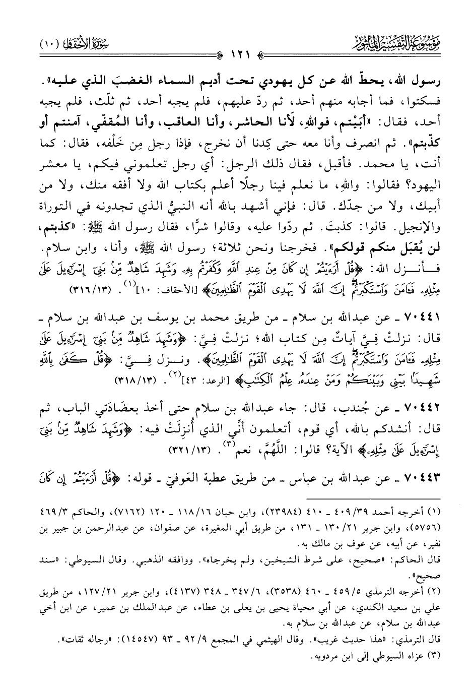رسول الله، يحطّ الله عن كل يهودي تحت أديم السماء الغضبَ الذي عليه». فسكتوا، فما أجابه منهم أحد، ثم ردّ عليهم، فلم يجبه أحد، ثم ثلّث، فلم يجبه أحد، فقال: «أبَيْتم، فواللهِ، لَأنا الحاشر، وأنا العاقب، وأنا المُقفّي، آمنتم أو كذّبتم». ثم انصرف وأنا معه حتى كِدنا أن نخرج، فإذا رجل مِن خَلْفه، فقال: كما أنت، يا محمد. فأقبل، فقال ذلك الرجل: أي رجل تعلموني فيكم، يا معشر اليهود؟ فقالوا: واللهِ، ما نعلم فينا رجلًا أعلم بكتاب الله ولا أفقه منك، ولا من أبيك، ولا من جدّك. قال: فإني أشهد بالله أنه النبيُّ الذي تجدونه في التوراة والإنجيل. قالوا: كذبتَ. ثم ردّوا عليه، وقالوا شرًّا، فقال رسول الله - صلى الله عليه وسلم -: «كذبتم، لن يُقبَل منكم قولكم». فخرجنا ونحن ثلاثة؛ رسول الله - صلى الله عليه وسلم -، وأنا، وابن سلام. فأنزل الله: {قُلْ أرَأَيْتُمْ إنْ كانَ مِن عِنْدِ اللَّهِ وكَفَرْتُمْ بِهِ وشَهِدَ شاهِدٌ مِن بَنِي إسْرائِيلَ عَلى مِثْلِهِ فَآمَنَ واسْتَكْبَرْتُمْ إنَّ اللَّهَ لا يَهْدِي القَوْمَ الظّالِمِينَ} [الأحقاف: ١٠] (¬١). (١٣/ ٣١٦)