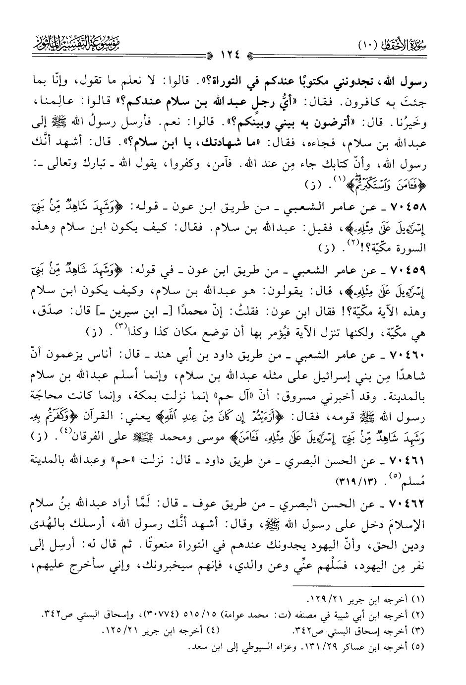 ٧٠٤٥٨ - عن عامر الشعبي -من طريق ابن عون- قوله: {وشَهِدَ شاهِدٌ مِن بَنِي إسْرائِيلَ عَلى مِثْلِهِ}، فقيل: عبد الله بن سلام. فقال: كيف يكون ابن سلام وهذه السورة مكّيّة؟! (¬٢). (ز)