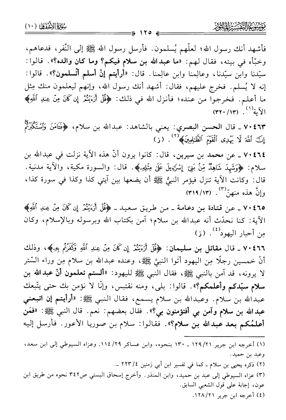 ٧٠٤٦٥ - عن قتادة بن دعامة -من طريق سعيد- {قُلْ أرَأَيْتُمْ إنْ كانَ مِن عِنْدِ اللَّهِ} الآية: كنا نحدّث أنه عبد الله بن سلام؛ آمن بكتاب الله وبرسوله وبالإسلام، وكان مِن أحبار اليهود (¬٤). (ز)