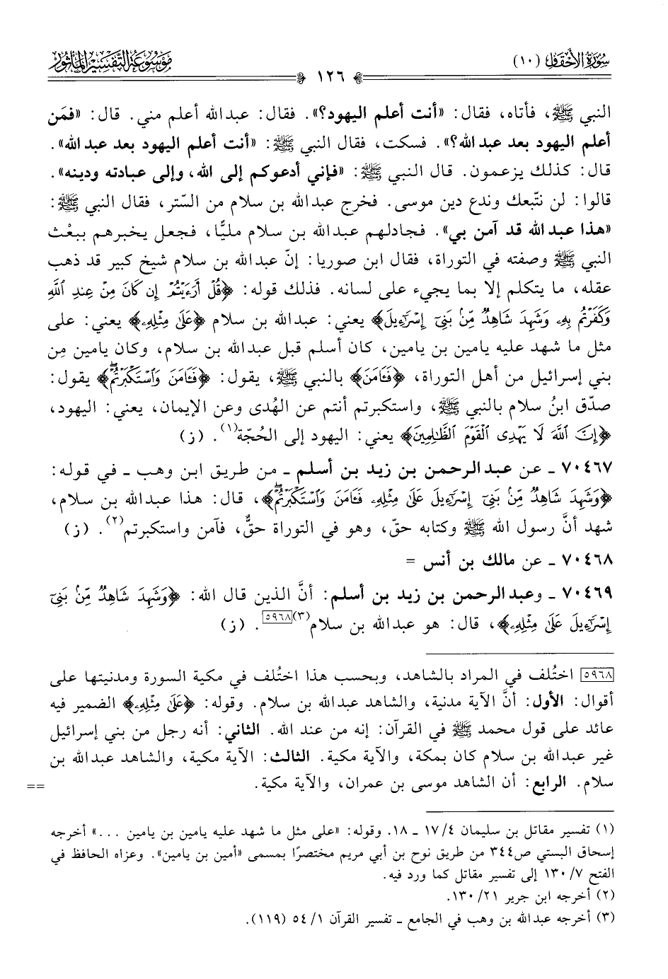 ٧٠٤٦٩ - وعبد الرحمن بن زيد بن أسلم: أنّ الذين قال الله: {وشَهِدَ شاهِدٌ مِن بَنِي إسْرائِيلَ عَلى مِثْلِهِ}، قال: هو عبد الله بن سلام (¬٣) [٥٩٦٨]. (ز)