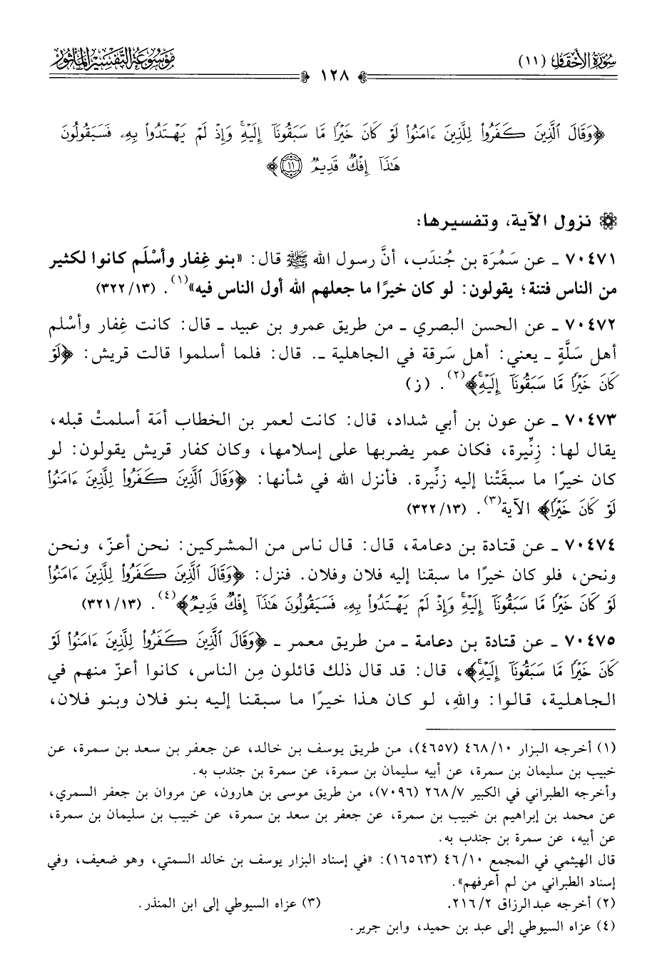 ٧٠٤٧٤ - عن قتادة بن دعامة، قال: قال ناس من المشركين: نحن أعزّ، ونحن ونحن، فلو كان خيرًا ما سبقنا إليه فلان وفلان. فنزل: {وقالَ الَّذِينَ كَفَرُوا لِلَّذِينَ آمَنُوا لَوْ كانَ خَيْرًا ما سَبَقُونا إلَيْهِ وإذْ لَمْ يَهْتَدُوا بِهِ فَسَيَقُولُونَ هَذا إفْكٌ قَدِيمٌ} (¬٤). (١٣/ ٣٢١)