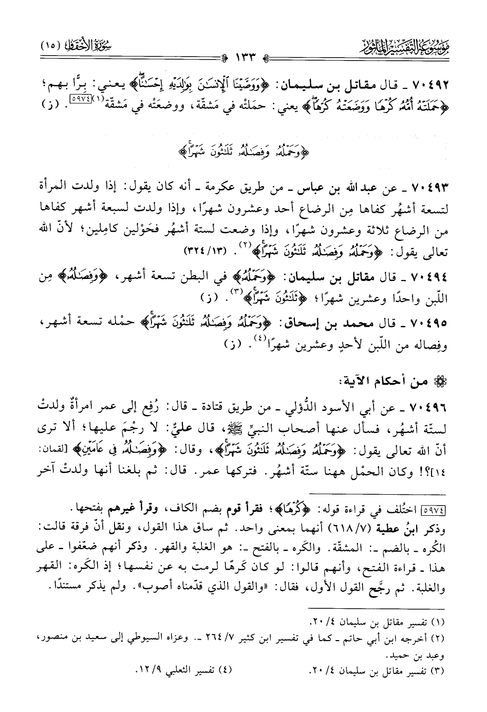 ٧٠٤٩٦ - عن أبي الأسود الدُّؤلي -من طريق قتادة- قال: رُفِع إلى عمر امرأةٌ ولدتْ لستّة أشهُر، فسأل عنها أصحاب النبيِّ - صلى الله عليه وسلم -، قال عليٌّ: لا رجْمَ عليها؛ ألا ترى أنّ الله تعالى يقول: {وحَمْلُهُ وفِصالُهُ ثَلاثُونَ شَهْرًا}، وقال: {وفِصالُهُ فِي عامَيْنِ} [لقمان: ١٤]؟! وكان الحمْل ههنا ستّة أشهُر. فتركها عمر. قال: ثم بلغنا أنها ولدتْ آخر