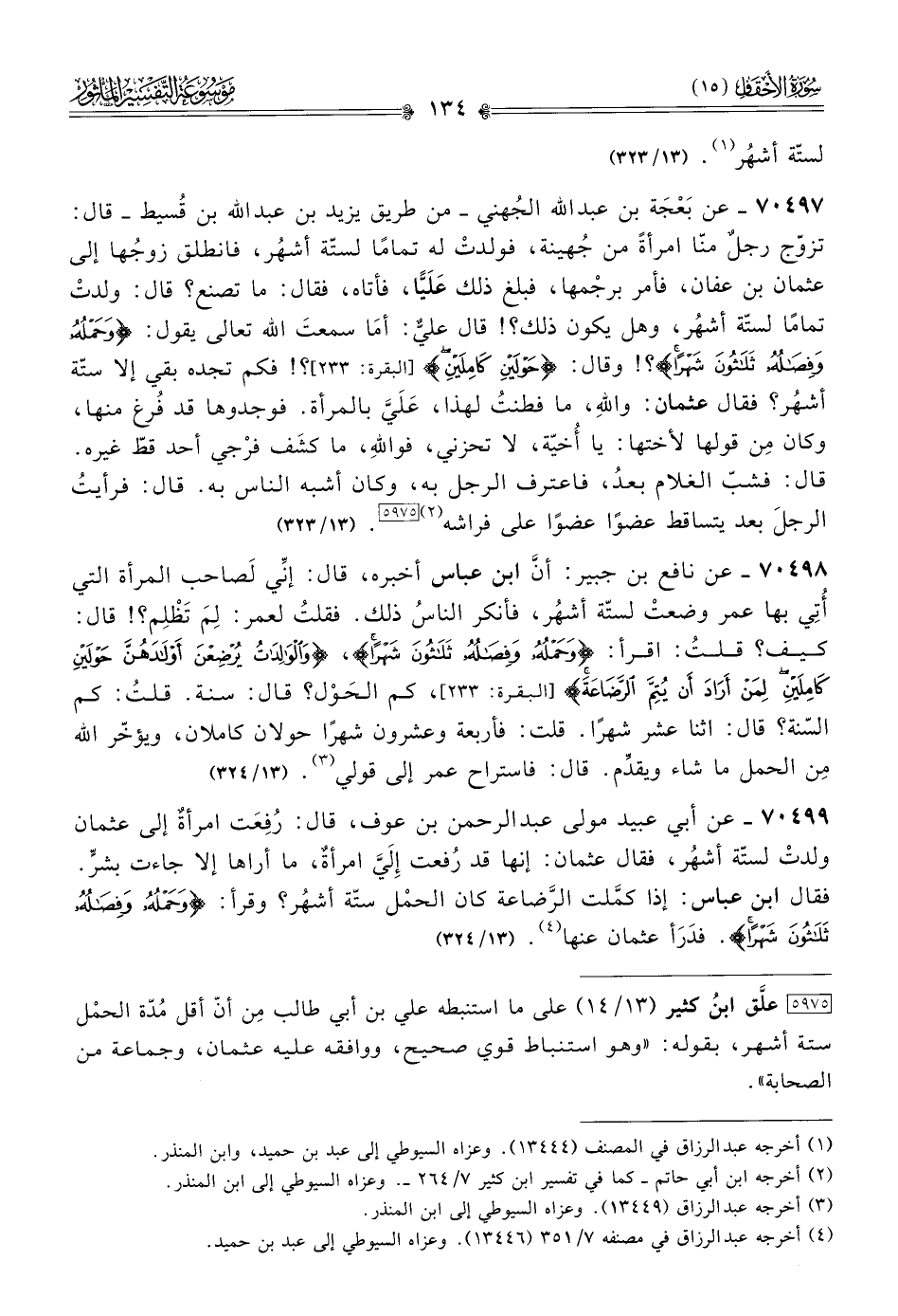 ٧٠٤٩٩ - عن أبي عبيد مولى عبد الرحمن بن عوف، قال: رُفِعَت امرأةٌ إلى عثمان ولدتْ لستّة أشهُر، فقال عثمان: إنها قد رُفعت إلَيَّ امرأةٌ، ما أراها إلا جاءت بشرٍّ. فقال ابن عباس: إذا كمَّلت الرَّضاعة كان الحمْل ستّة أشهُر؟ وقرأ: {وحَمْلُهُ وفِصالُهُ ثَلاثُونَ شَهْرًا}. فدَرَأ عثمان عنها (¬٤). (١٣/ ٣٢٤)