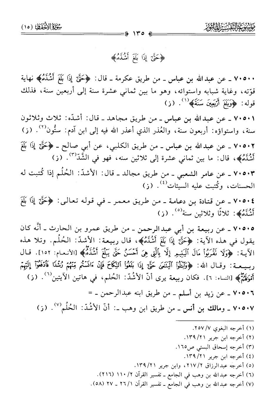 ٧٠٥٠٠ - عن عبد الله بن عباس -من طريق عكرمة- قال: {حَتّى إذا بَلَغَ أشُدَّهُ} نهاية قوّته، وغاية شبابه واستوائه، وهو ما