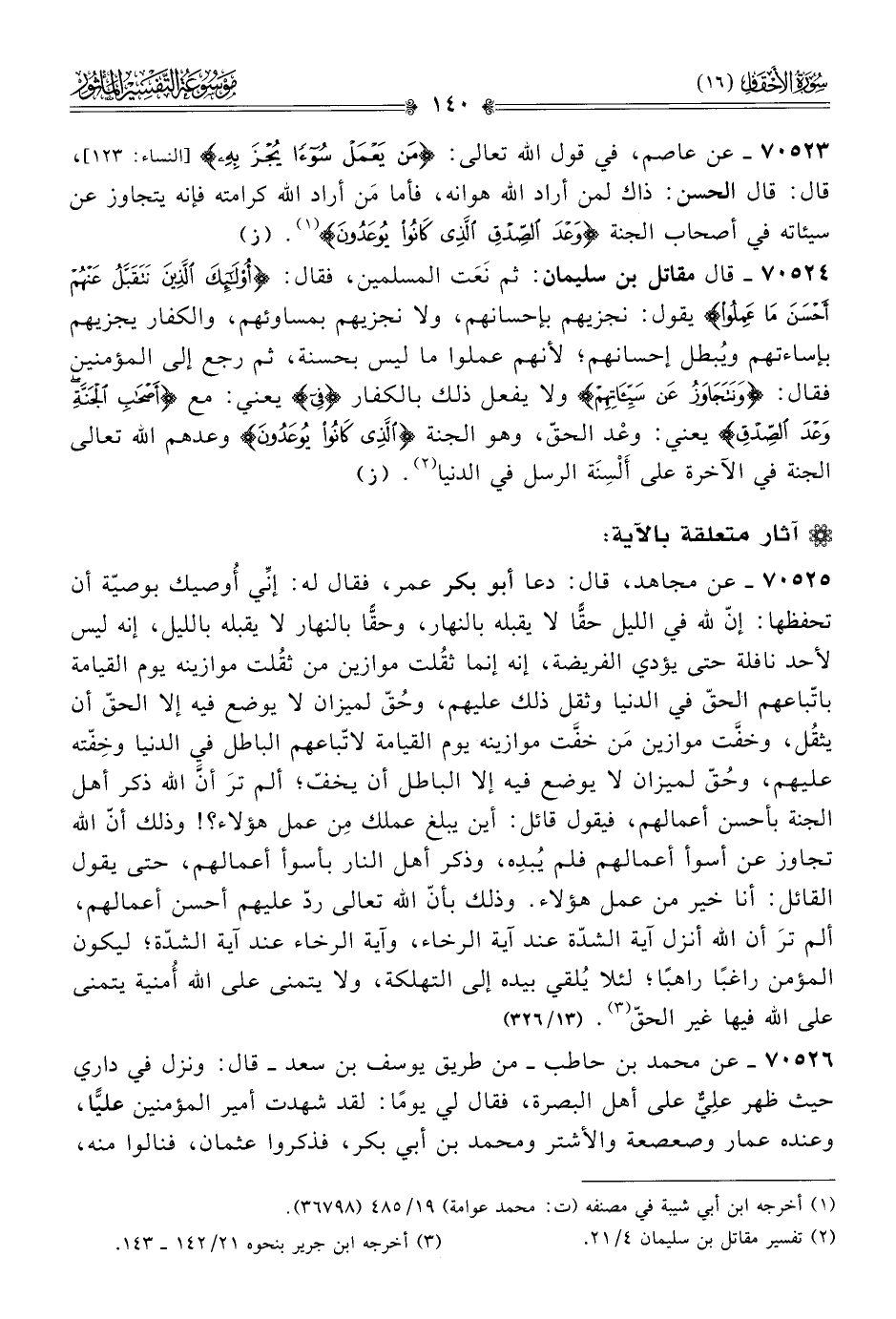 ٧٠٥٢٥ - عن مجاهد، قال: دعا أبو بكر عمر، فقال له: إنِّي أُوصيك بوصيّة أن تحفظها: إنّ لله في الليل حقًّا لا يقبله بالنهار، وحقًّا بالنهار لا يقبله بالليل، إنه ليس لأحد نافلة حتى يؤدي الفريضة، إنه إنما ثقُلت موازين من ثقُلت موازينه يوم القيامة باتّباعهم الحقّ في الدنيا وثقل ذلك عليهم، وحُقّ لميزان لا يوضع فيه إلا الحقّ أن يثقُل، وخفَّت موازين مَن خفَّت موازينه يوم القيامة لاتّباعهم الباطل في الدنيا وخِفّته عليهم، وحُقّ لميزان لا يوضع فيه إلا الباطل أن يخفّ؛ ألم ترَ أنّ الله ذكر أهل الجنة بأحسن أعمالهم، فيقول قائل: أين يبلغ عملك مِن عمل هؤلاء؟! وذلك أنّ الله تجاوز عن أسوأ أعمالهم فلم يُبدِه، وذكر أهل النار بأسوأ أعمالهم، حتى يقول القائل: أنا خير من عمل هؤلاء. وذلك بأنّ الله تعالى ردّ عليهم أحسن أعمالهم، ألم ترَ أن الله أنزل آية الشدّة عند آية الرخاء، وآية الرخاء عند آية الشدّة؛ ليكون المؤمن راغبًا راهبًا؛ لئلا يُلقي بيده إلى التهلكة، ولا يتمنى على الله أُمنية يتمنى على الله فيها غير الحقّ (¬٣). (١٣/ ٣٢٦)