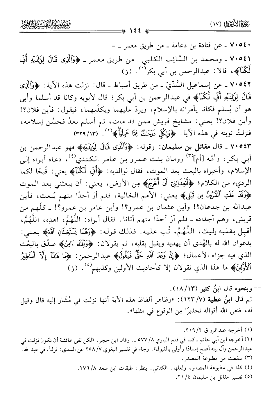 ٧٠٥٤١ - ومحمد بن السّائِب الكلبي -من طريق معمر- {والَّذِي قالَ لِوالِدَيْهِ أُفٍّ لَكُما}، قالا: عبد الرحمن بن أبي بكر (¬١). (ز)