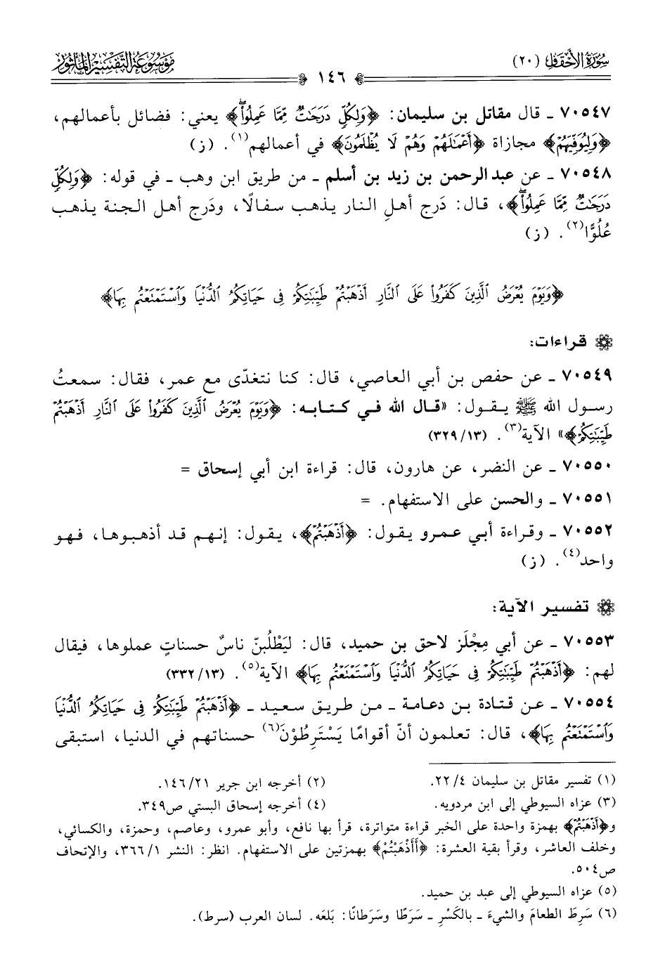 ٧٠٥٥٤ - عن قتادة بن دعامة -من طريق سعيد- {أذْهَبْتُمْ طَيِّباتِكُمْ فِي حَياتِكُمُ الدُّنْيا واسْتَمْتَعْتُمْ بِها}، قال: تعلمون أنّ أقوامًا يَسْتَرِطُونَ (¬٦) حسناتهم في الدنيا، استبقى