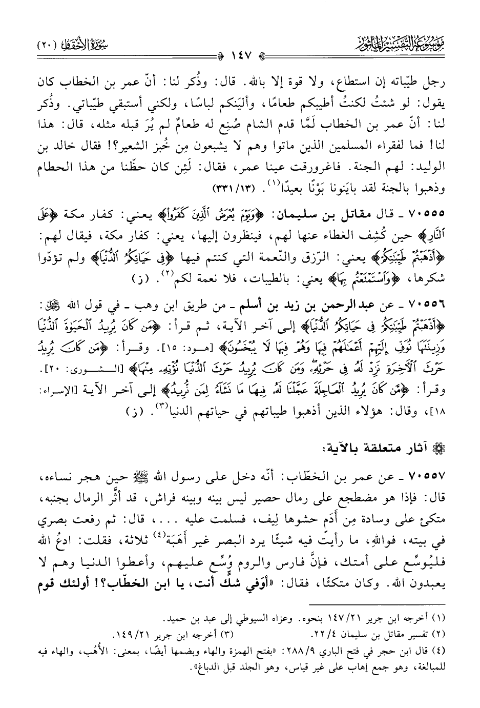 ٧٠٥٥٦ - عن عبد الرحمن بن زيد بن أسلم -من طريق ابن وهب- في قول الله - عز وجل -: {أذْهَبْتُمْ طَيِّباتِكُمْ فِي حَياتِكُمُ الدُّنْيا} إلى آخر الآية، ثم قرأ: {مَن كانَ يُرِيدُ الحَياةَ الدُّنْيا وزِينَتَها نُوَفِّ إلَيْهِمْ أعْمالَهُمْ فِيها وهُمْ فِيها لا يُبْخَسُونَ} [هود: ١٥]. وقرأ: {مَن كانَ يُرِيدُ حَرْثَ الآخِرَةِ نَزِدْ لَهُ فِي حَرْثِهِ ومَن كانَ يُرِيدُ حَرْثَ الدُّنْيا نُؤْتِهِ مِنها} [الشورى: ٢٠]. وقرأ: {مَن كانَ يُرِيدُ العاجِلَةَ عَجَّلْنا لَهُ فِيها ما نَشاءُ لِمَن نُرِيدُ} إلى آخر الآية [الإسراء: ١٨]، وقال: هؤلاء الذين أذهبوا طيباتهم في حياتهم الدنيا (¬٣). (ز)