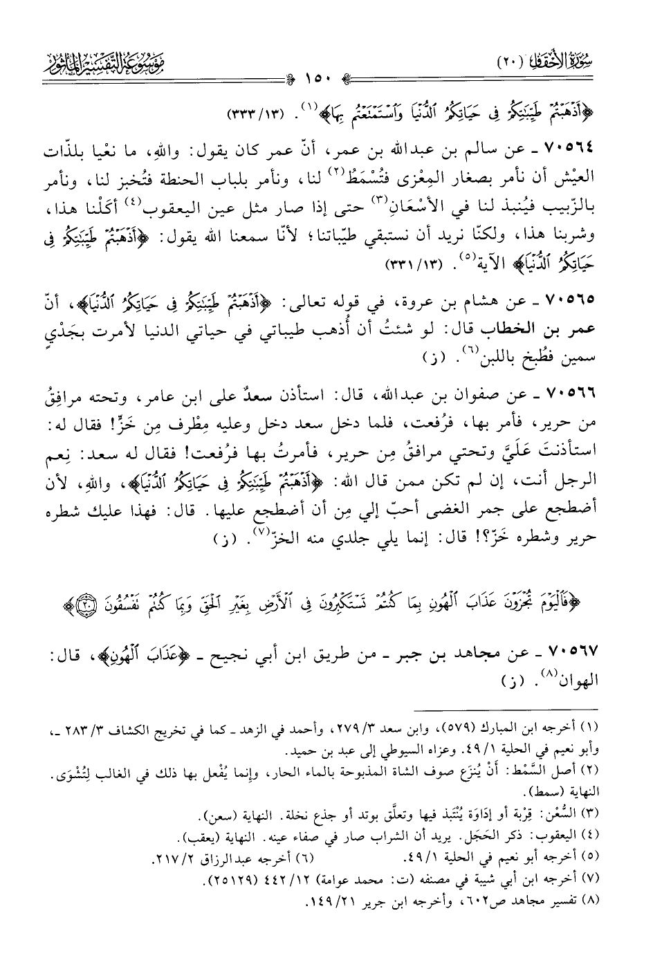 ٧٠٥٦٤ - عن سالم بن عبد الله بن عمر، أنّ عمر كان يقول: واللهِ، ما نعْيا بلذّات العيْش أن نأمر بصغار المِعْزى فتُسْمَطُ (¬٢) لنا، ونأمر بلباب الحنطة فتُخبز لنا، ونأمر بالزّبيب فيُنبذ لنا في الأسْعانِ (¬٣) حتى إذا صار مثل عين اليعقوب (¬٤) أكَلْنا هذا، وشربنا هذا، ولكنّا نريد أن نستبقي طيّباتنا؛ لأنّا سمعنا الله يقول: {أذْهَبْتُمْ طَيِّباتِكُمْ فِي حَياتِكُمُ الدُّنْيا} الآية (¬٥). (١٣/ ٣٣١)