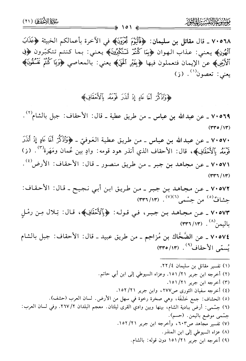 ٧٠٥٧٣ - عن مجاهد بن جبر، في قوله: {بالأَحْقافِ}، قال: تِلال مِن رمْلٍ باليمن (¬٨). (١٣/ ٣٣٦)