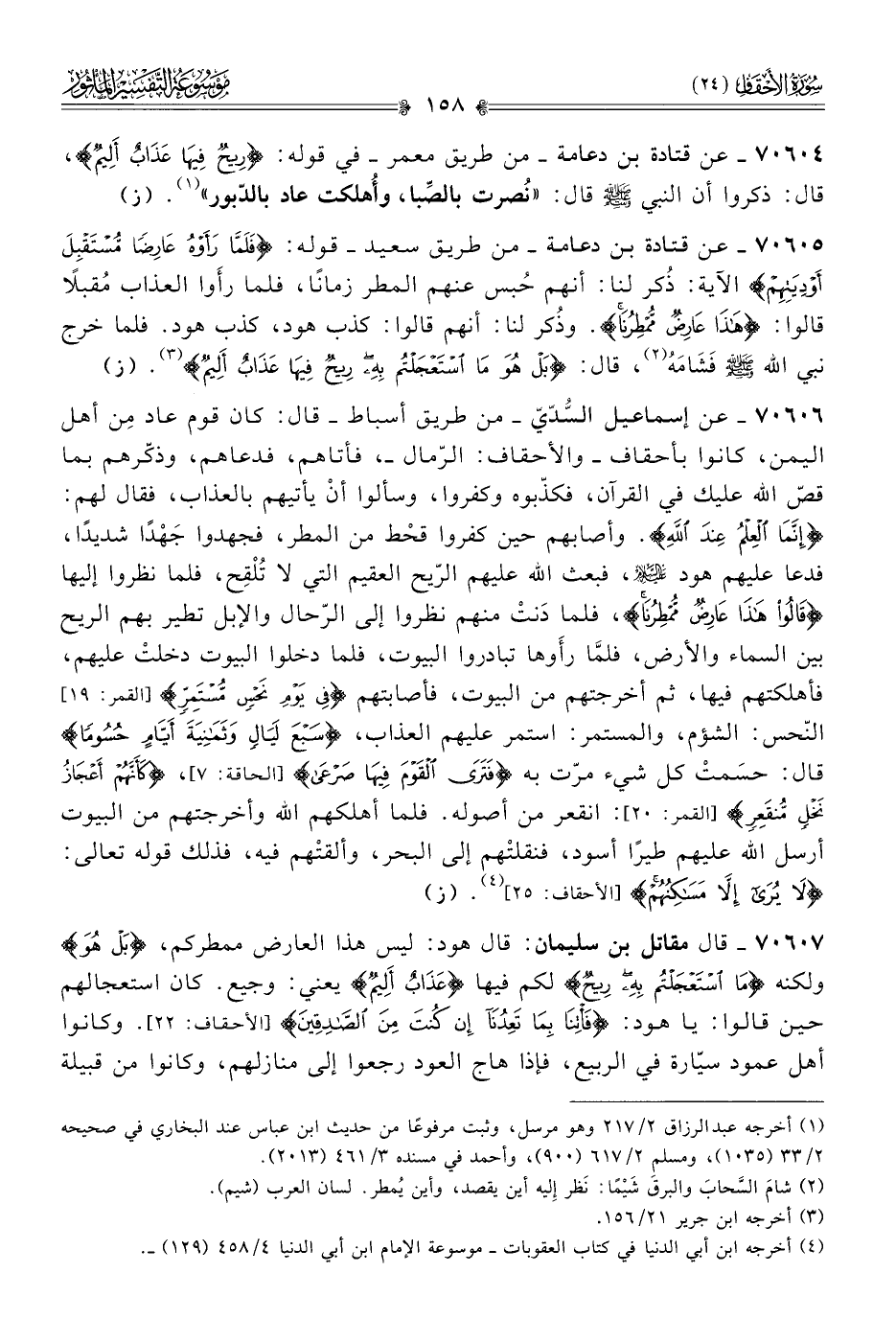 ٧٠٦٠٦ - عن إسماعيل السُّدّيّ -من طريق أسباط- قال: كان قوم عاد مِن أهل اليمن، كانوا بأحقاف -والأحقاف: الرّمال-، فأتاهم، فدعاهم، وذكّرهم بما قصّ الله عليك في القرآن، فكذّبوه وكفروا، وسألوا أنْ يأتيهم بالعذاب، فقال لهم: {إنَّما العِلْمُ عِنْدَ اللَّهِ}. وأصابهم حين كفروا قحْط من المطر، فجهدوا جَهْدًا شديدًا، فدعا عليهم هود - عليه السلام -، فبعث الله عليهم الرّيح العقيم التي لا تُلْقِح، فلما نظروا إليها {قالُوا هَذا عارِضٌ مُمْطِرُنا}، فلما دَنتْ منهم نظروا إلى الرّحال والإبل تطير بهم الريح بين السماء والأرض، فلمّا رأَوها تبادروا البيوت، فلما دخلوا البيوت دخلتْ عليهم، فأهلكتهم فيها، ثم أخرجتهم من البيوت، فأصابتهم {فِي يَوْمِ نَحْسٍ مُسْتَمِرٍ} [القمر: ١٩] النّحس: الشؤم، والمستمر: استمر عليهم العذاب، {سَبْعَ لَيالٍ وثَمانِيَةَ أيامٍ حُسُومًا} قال: حسَمتْ كل شيء مرّت به {فَتَرى القَوْمَ فِيهْا صَرْعى} [الحاقة: ٧]، {كَأَنَّهُمْ أعْجازُ نَخْلٍ مُنْقَعِرٍ} [القمر: ٢٠]: انقعر من أصوله. فلما أهلكهم الله وأخرجتهم من البيوت أرسل الله عليهم طيرًا أسود، فنقلتْهم إلى البحر، وألقتْهم فيه، فذلك قوله تعالى: {لا يُرى إلّا مَساكِنُهُمْ} [الأحقاف: ٢٥] (¬٤). (ز)