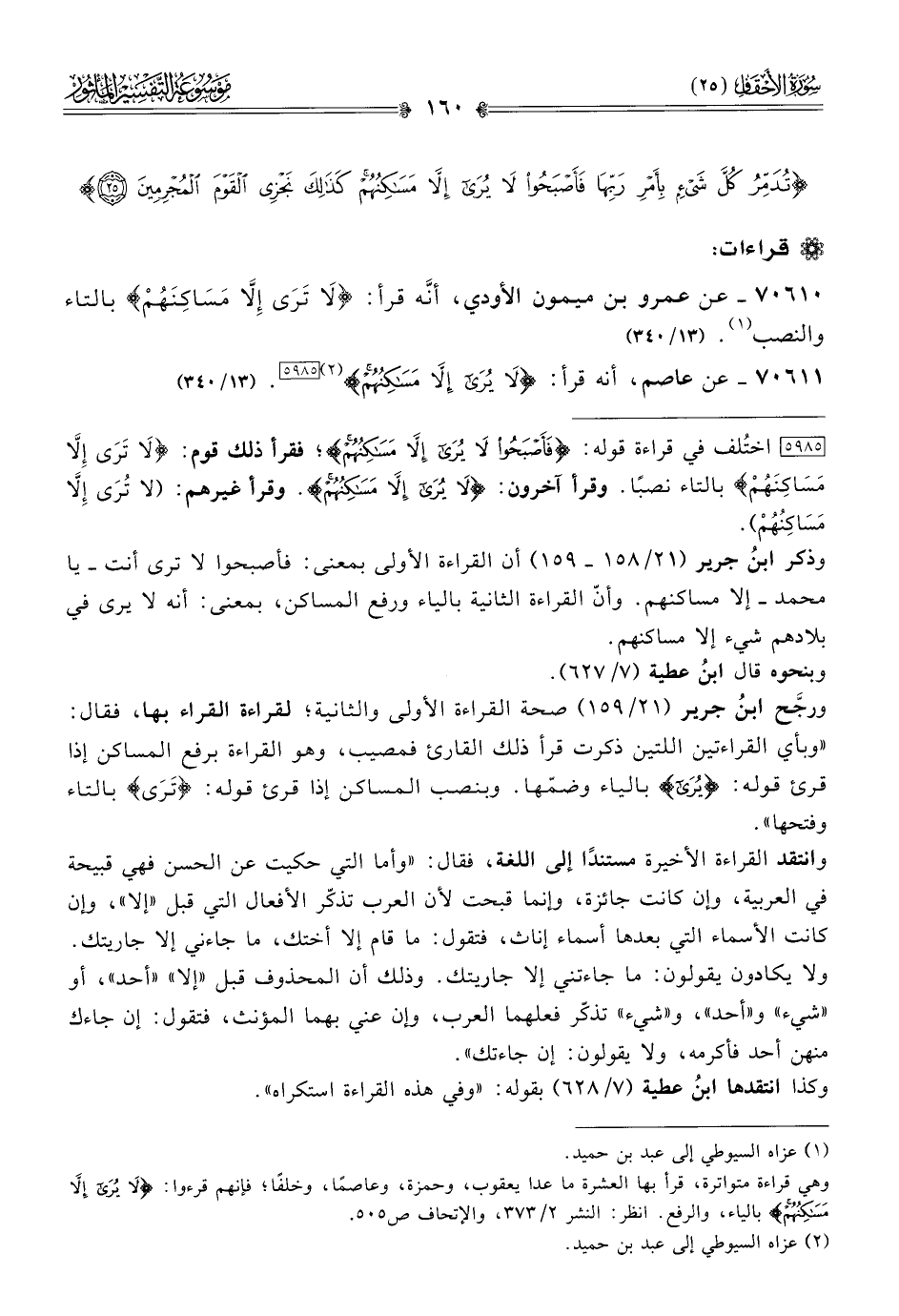 وذكر ابنُ جرير (٢١/ ١٥٨ - ١٥٩) أن القراءة الأولى بمعنى: فأصبحوا لا ترى أنت -يا محمد- إلا مساكنهم. وأنّ القراءة الثانية بالياء ورفع المساكن، بمعنى: أنه لا يرى في بلادهم شيء إلا مساكنهم.