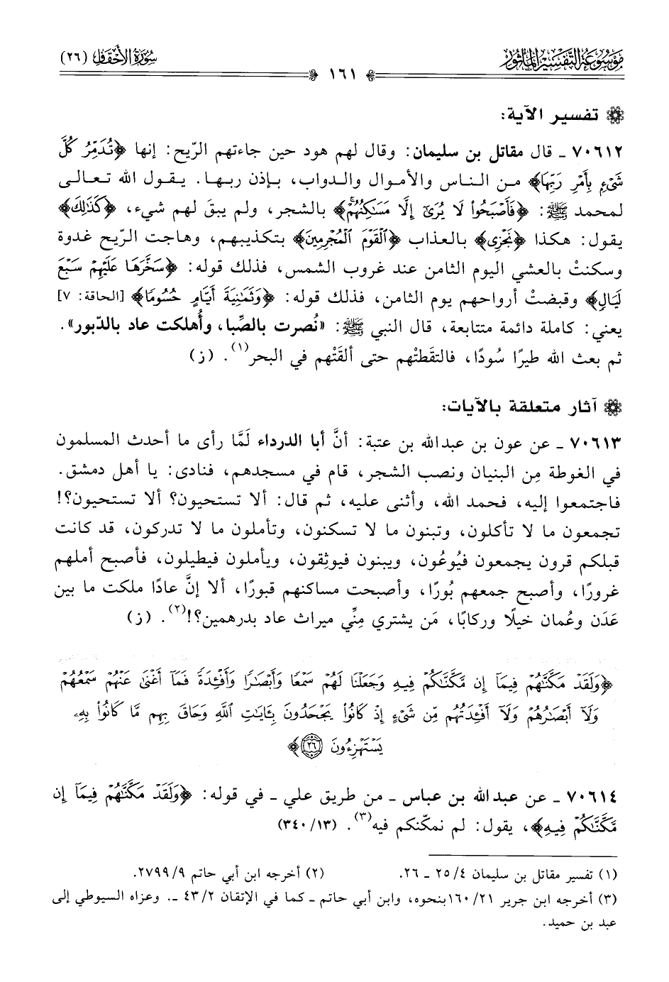 ٧٠٦١٢ - قال مقاتل بن سليمان: وقال لهم هود حين جاءتهم الرّيح: إنها {تُدَمِّرُ كُلَّ شَيْءٍ بِأَمْرِ رَبِّها} من الناس والأموال والدواب، بإذن ربها. يقول الله تعالى لمحمد - صلى الله عليه وسلم -: {فَأَصْبَحُوا لا يُرى إلّا مَساكِنُهُمْ} بالشجر، ولم يبقَ لهم شيء، {كَذَلِكَ} يقول: هكذا {نجزي} بالعذاب {القَوْمَ المُجْرِمِينَ} بتكذيبهم، وهاجت الرّيح غدوة وسكنتْ بالعشي اليوم الثامن عند غروب الشمس، فذلك قوله: {سَخَّرَها عَلَيْهِمْ سَبْعَ لَيالٍ} وقبضتْ أرواحهم يوم الثامن، فذلك قوله: {وثَمانِيَةَ أيّامٍ حُسُومًا} [الحاقة: ٧] يعني: كاملة دائمة متتابعة، قال النبي - صلى الله عليه وسلم -: «نُصرت بالصِّبا، وأُهلكت عاد بالدّبور». ثم بعث الله طيرًا سُودًا، فالتقَطتْهم حتى ألقَتْهم في البحر (¬١). (ز)