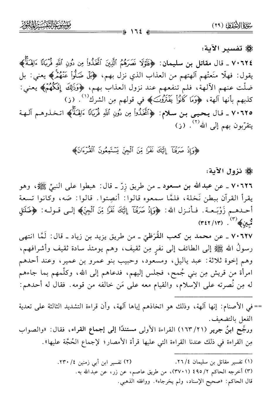 ٧٠٦٢٦ - عن عبد الله بن مسعود -من طريق زِرّ- قال: هبطوا على النبيِّ - صلى الله عليه وسلم -، وهو يقرأ القرآن ببطن نَخلة، فلمّا سمعوه قالوا: أنصِتوا. قالوا: صَه، وكانوا تسعة أحدهم زَوْبَعة. فأنزل الله: {وإذْ صَرَفْنا إلَيْكَ نَفَرًا مِنَ الجِنِّ} إلى قوله: {ضَلال مُبِين} (¬٣). (١٣/ ٣٤٢)