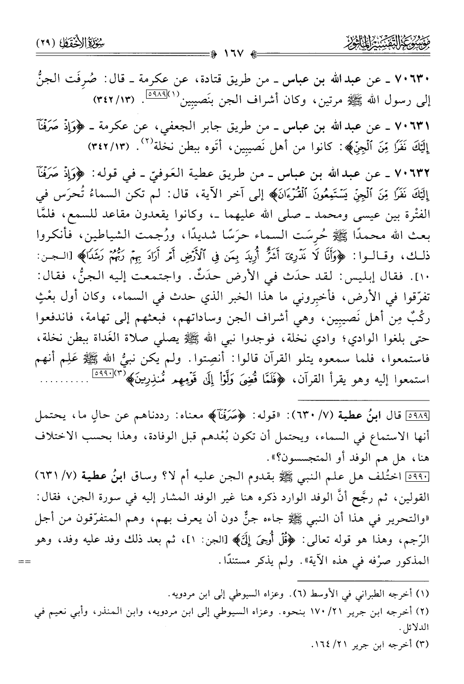 ٧٠٦٣٢ - عن عبد الله بن عباس -من طريق عطية العَوفيّ- في قوله: {وإذْ صَرَفْنا إلَيْكَ نَفَرًا مِنَ الجِنِّ يَسْتَمِعُونَ القُرْآنَ} إلى آخر الآية، قال: لم تكن السماءُ تُحرَس في الفتْرة بين عيسى ومحمد -صلى الله عليهما-، وكانوا يقعدون مقاعد للسمع، فلمّا بعث الله محمدًا - صلى الله عليه وسلم - حُرِسَت السماء حرَسًا شديدًا، ورُجمت الشياطين، فأنكروا ذلك، وقالوا: {وأَنّا لا نَدْرِي أشَرٌّ أُرِيدَ بِمَن فِي الأَرْضِ أمْ أرادَ بِهِمْ رَبُّهُمْ رَشَدًا} [الجن: ١٠]. فقال إبليس: لقد حدَث في الأرض حدَثٌ. واجتمعت إليه الجنُّ، فقال: تفرّقوا في الأرض، فأخبِروني ما هذا الخبر الذي حدث في السماء، وكان أول بعْثٍ ركْبٌ مِن أهل نَصيبِين، وهي أشراف الجن وساداتهم، فبعثهم إلى تهامة، فاندفعوا حتى بلغوا الوادي؛ وادي نخلة، فوجدوا نبي الله - صلى الله عليه وسلم - يصلي صلاة الغَداة ببطن نخلة، فاستمعوا، فلما سمعوه يتلو القرآن قالوا: أنصِتوا. ولم يكن نبيُّ الله - صلى الله عليه وسلم - عَلِم أنهم استمعوا إليه وهو يقرأ القرآن، {فَلَمّا قُضِيَ ولَّوْا إلى قَوْمِهِمْ مُنْذِرِينَ} (¬٣) [٥٩٩٠] ....