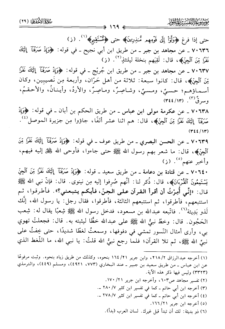 ٧٠٦٣٧ - عن مجاهد بن جبر -من طريق ابن جُريْج- في قوله: {وإذْ صَرَفْنا إلَيْكَ نَفَرًا مِنَ الجِنِّ}، قال: كانوا سبعة: ثلاثة من أهل حَرّان، وأربعة مِن نَصيبِين، وكان أسماؤهم؛ حسيٌ، ومسيٌ، وشاصِرٌ، وماصِرٌ، والأردُ، وأينانُ، والأحقمُ، وسرقٌ (¬٣). (١٣/ ٣٤٤)