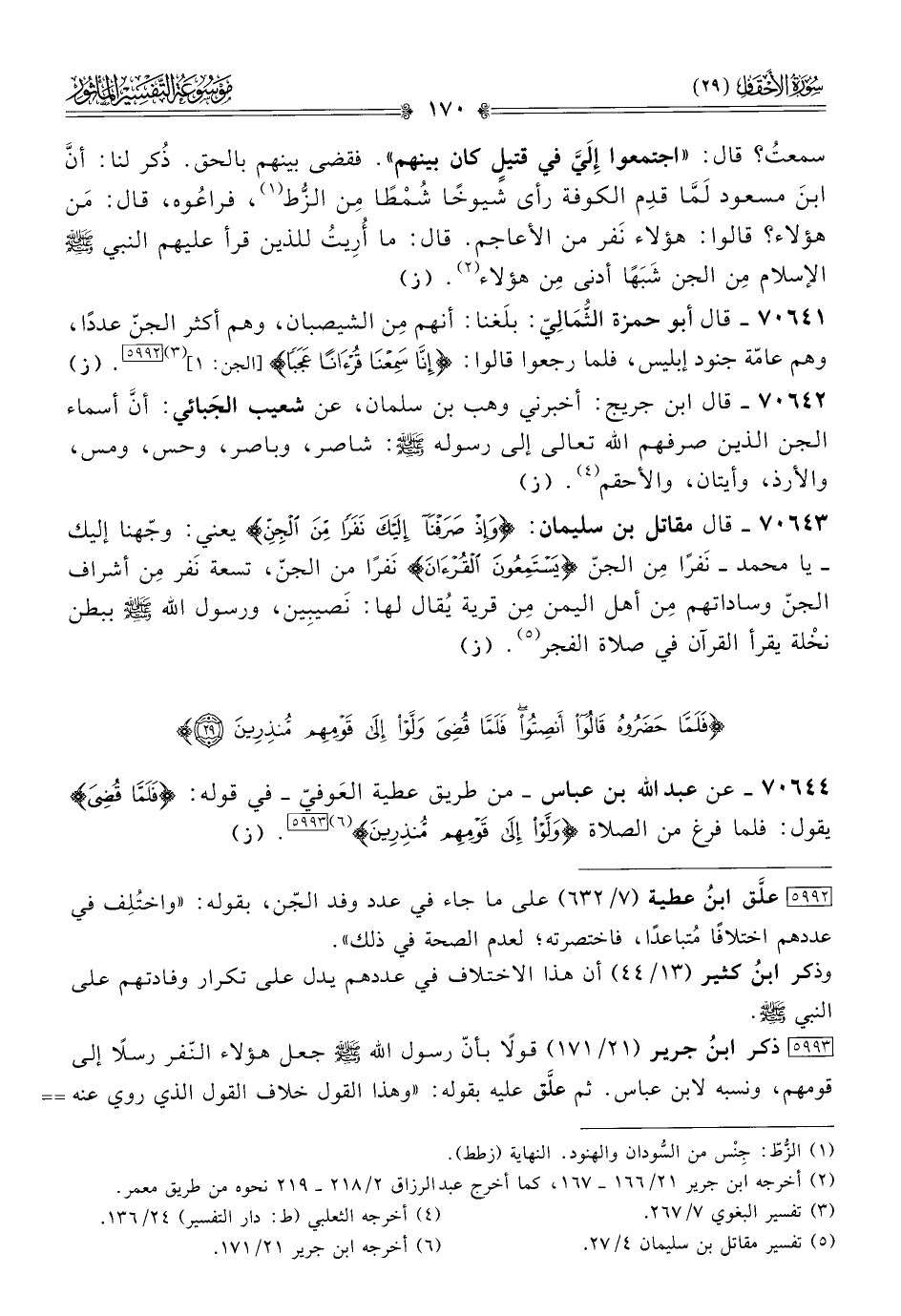 ٧٠٦٤٣ - قال مقاتل بن سليمان: {وإذْ صَرَفْنا إلَيْكَ نَفَرًا مِنَ الجِنِّ} يعني: وجّهنا إليك -يا محمد- نَفرًا مِن الجنّ {يَسْتَمِعُونَ القُرْآنَ} نَفرًا من الجنّ، تسعة نَفر مِن أشراف الجنّ وساداتهم مِن أهل اليمن مِن قرية يُقال لها: نَصيبِين، ورسول الله - صلى الله عليه وسلم - ببطن نخْلة يقرأ القرآن في صلاة الفجر (¬٥). (ز)