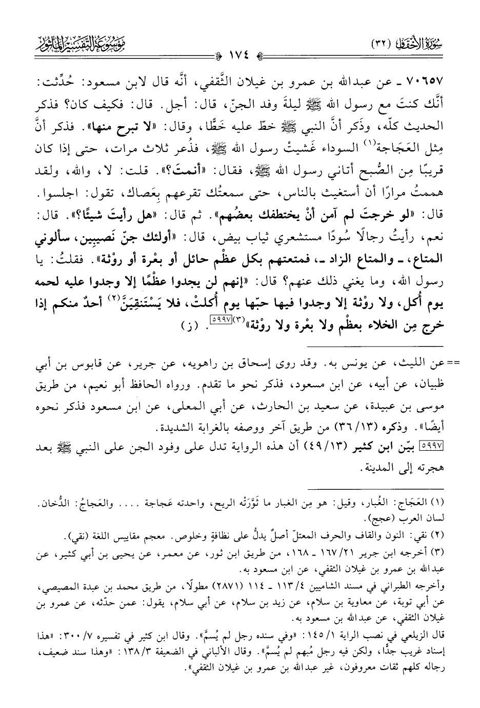 ٧٠٦٥٧ - عن عبد الله بن عمرو بن غيلان الثَّقفي، أنّه قال لابن مسعود: حُدِّثت: أنّك كنتَ مع رسول الله - صلى الله عليه وسلم - ليلةَ وفد الجنّ، قال: أجل. قال: فكيف كان؟ فذكر الحديث كلّه، وذَكر أنّ النبي - صلى الله عليه وسلم - خطّ عليه خَطًّا، وقال: «لا تبرح منها». فذكر أنّ مِثل العَجاجة (¬١) السوداء غَشيتْ رسول الله - صلى الله عليه وسلم -، فذُعر ثلاث مرات، حتى إذا كان قريبًا مِن الصُّبح أتاني رسول الله - صلى الله عليه وسلم -، فقال: «أنمتَ؟». قلت: لا، والله، ولقد هممتُ مرارًا أن أستغيث بالناس، حتى سمعتُك تقرعهم بِعَصاك، تقول: اجلسوا. قال: «لو خرجتَ لم آمن أنْ يختطفك بعضُهم». ثم قال: «هل رأيتَ شيئًا؟». قال: نعم، رأيتُ رجالًا سُودًا مستشعري ثياب بيض، قال: «أولئك جنّ نَصيبِين، سألوني المتاع، -والمتاع الزاد-، فمتعتهم بكل عظْم حائل أو بعْرة أو روْثة». فقلتُ: يا رسول الله، وما يغني ذلك عنهم؟ قال: «إنهم لن يجدوا عظْمًا إلا وجدوا عليه لحمه يوم أُكل، ولا روْثة إلا وجدوا فيها حبّها يوم أُكلتْ، فلا يَسْتَنقِيَنَّ (¬٢) أحدٌ منكم إذا خرج مِن الخلاء بعظْم ولا بعْرة ولا روْثة» (¬٣) [٥٩٩٧]. (ز)