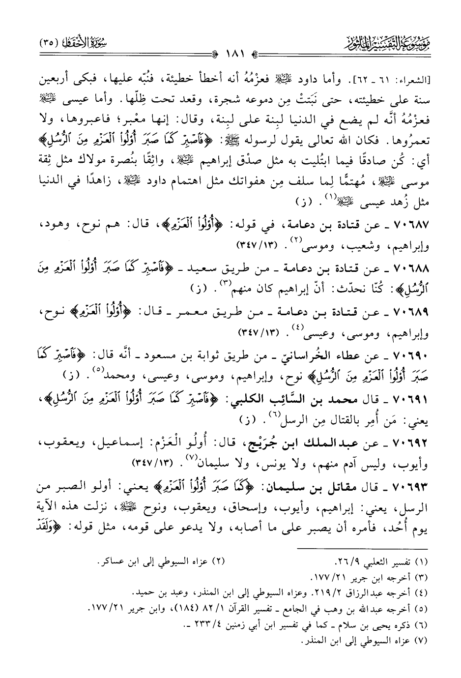 ٧٠٦٨٩ - عن قتادة بن دعامة -من طريق معمر- قال: {أُولُو العَزْمِ} نوح، وإبراهيم، وموسى، وعيسى (¬٤). (١٣/ ٣٤٧)