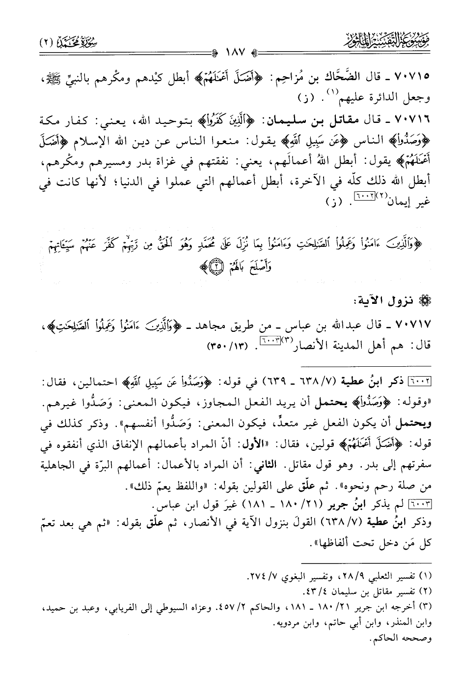 ٧٠٧١٧ - قال عبد الله بن عباس -من طريق مجاهد- {والَّذِينَ آمَنُوا وعَمِلُوا الصّالِحاتِ}، قال: هم أهل المدينة الأنصار (¬٣) [٦٠٠٣]. (١٣/ ٣٥٠)