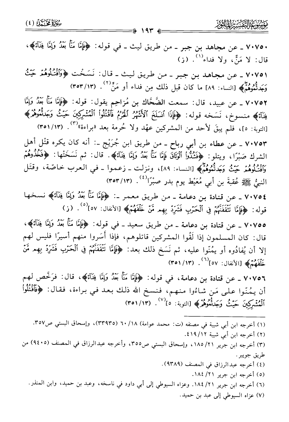 ٧٠٧٥٤ - عن قتادة بن دعامة -من طريق معمر-: {فَإمّا مَنًّا بَعْدُ وإمّا فِداءً} نسخها قوله: {فَإمّا تَثْقَفَنَّهُمْ فِي الحَرْبِ فَشَرِّدْ بِهِمْ مَن خَلْفَهُمْ} [الأنفال: ٥٧] (¬٥). (ز)