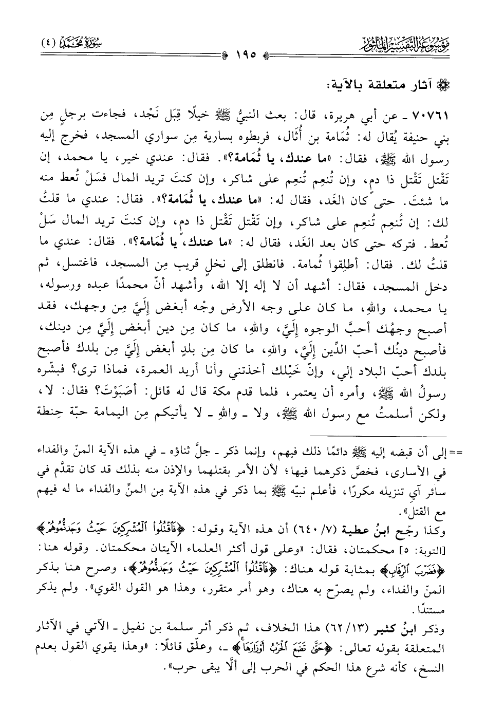 ٧٠٧٦١ - عن أبي هريرة، قال: بعث النبيُّ - صلى الله عليه وسلم - خيلًا قِبَل نَجْد، فجاءت برجلٍ مِن بني حنيفة يُقال له: ثُمامة بن أُثال، فربطوه بسارية مِن سواري المسجد، فخرج إليه رسول الله - صلى الله عليه وسلم -، فقال: «ما عندك، يا ثُمامة؟». فقال: عندي خير، يا محمد، إن تَقْتل تَقْتل ذا دمٍ، وإن تُنعِم تُنعِم على شاكر، وإن كنتَ تريد المال فسَلْ تُعط منه ما شئتَ. حتى كان الغَد، فقال له: «ما عندك، يا ثُمامة؟». فقال: عندي ما قلتُ لك: إن تُنعِم تُنعِم على شاكر، وإن تَقْتل تَقْتل ذا دمٍ، وإن كنتَ تريد المال سَلْ تُعط. فتركه حتى كان بعد الغَد، فقال له: «ما عندك، يا ثُمامة؟». فقال: عندي ما قلتُ لك. فقال: أطلِقوا ثُمامة. فانطلق إلى نخلٍ قريب مِن المسجد، فاغتسل، ثم دخل المسجد، فقال: أشهد أن لا إله إلا الله، وأشهد أنّ محمدًا عبده ورسوله، يا محمد، واللهِ، ما كان على وجه الأرض وجْه أبغض إلَيَّ مِن وجهك، فقد أصبح وجهُك أحبَّ الوجوه إلَيَّ، واللهِ، ما كان مِن دين أبغض إلَيَّ مِن دينك، فأصبح دينُك أحبّ الدِّين إلَيَّ، واللهِ، ما كان مِن بلدٍ أبغض إلَيَّ مِن بلدك فأصبح بلدك أحبّ البلاد إلي، وإنّ خَيْلك أخذتني وأنا أريد العمرة، فماذا ترى؟ فبشّره رسولُ الله - صلى الله عليه وسلم -، وأمره أن يعتمر، فلما قدم مكة قال له قائل: أصَبَوْتَ؟ فقال: لا، ولكن أسلمتُ مع رسول الله - صلى الله عليه وسلم -، ولا -واللهِ- لا يأتيكم مِن اليمامة حبّة حِنطة