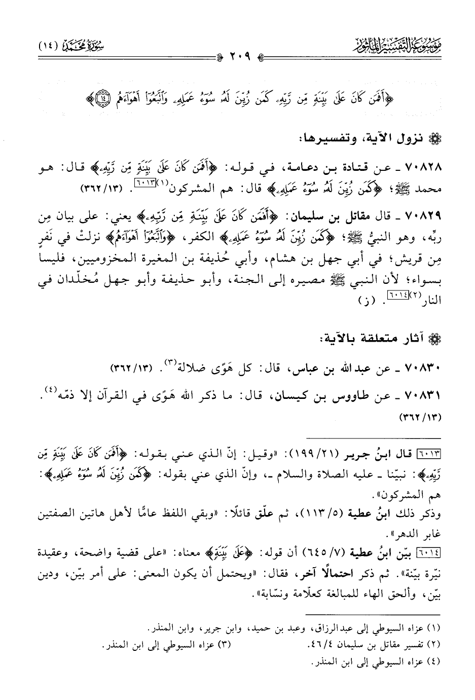 ٧٠٨٢٩ - قال مقاتل بن سليمان: {أفَمَن كانَ عَلى بَيِّنَةٍ مِن رَبِّهِ} يعني: على بيان مِن ربِّه، وهو النبيُّ - صلى الله عليه وسلم -؛ {كَمَن زُيِّنَ لَهُ سُوءُ عَمَلِهِ} الكفر، {واتَّبَعُوا أهْواءَهُمْ} نزلتْ في نَفرٍ مِن قريش؛ في أبي جهل بن هشام، وأبي حُذيفة بن المغيرة المخزوميين، فليسا بسواء؛ لأن النبي - صلى الله عليه وسلم - مصيره إلى الجنة، وأبو حذيفة وأبو جهل مُخلّدان في النار (¬٢) [٦٠١٤]. (ز)