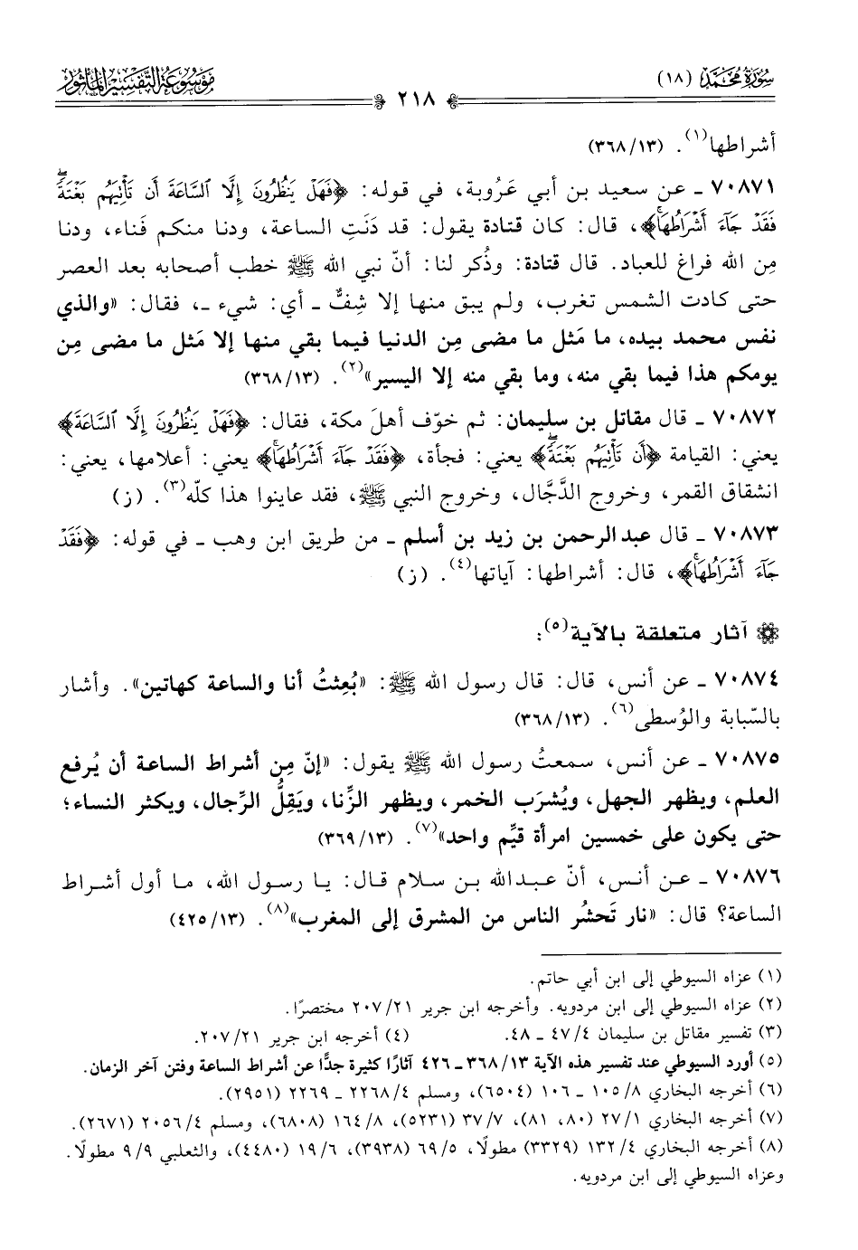 (¬٥) أورد السيوطي عند تفسير هذه الآية ١٣/ ٣٦٨ - ٤٢٦ آثارًا كثيرة جدًّا عن أشراط الساعة وفتن اخر الزمان.