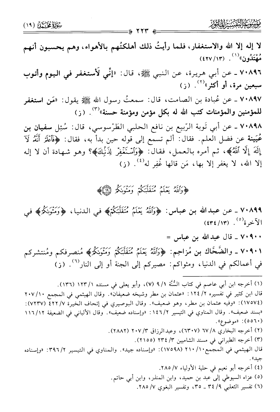 ٧٠٨٩٩ - عن عبد الله بن عباس: {واللَّهُ يَعْلَمُ مُتَقَلَّبَكُمْ} في الدنيا، {ومَثْواكُمْ} في الآخرة (¬٥). (١٣/ ٤٣٤)