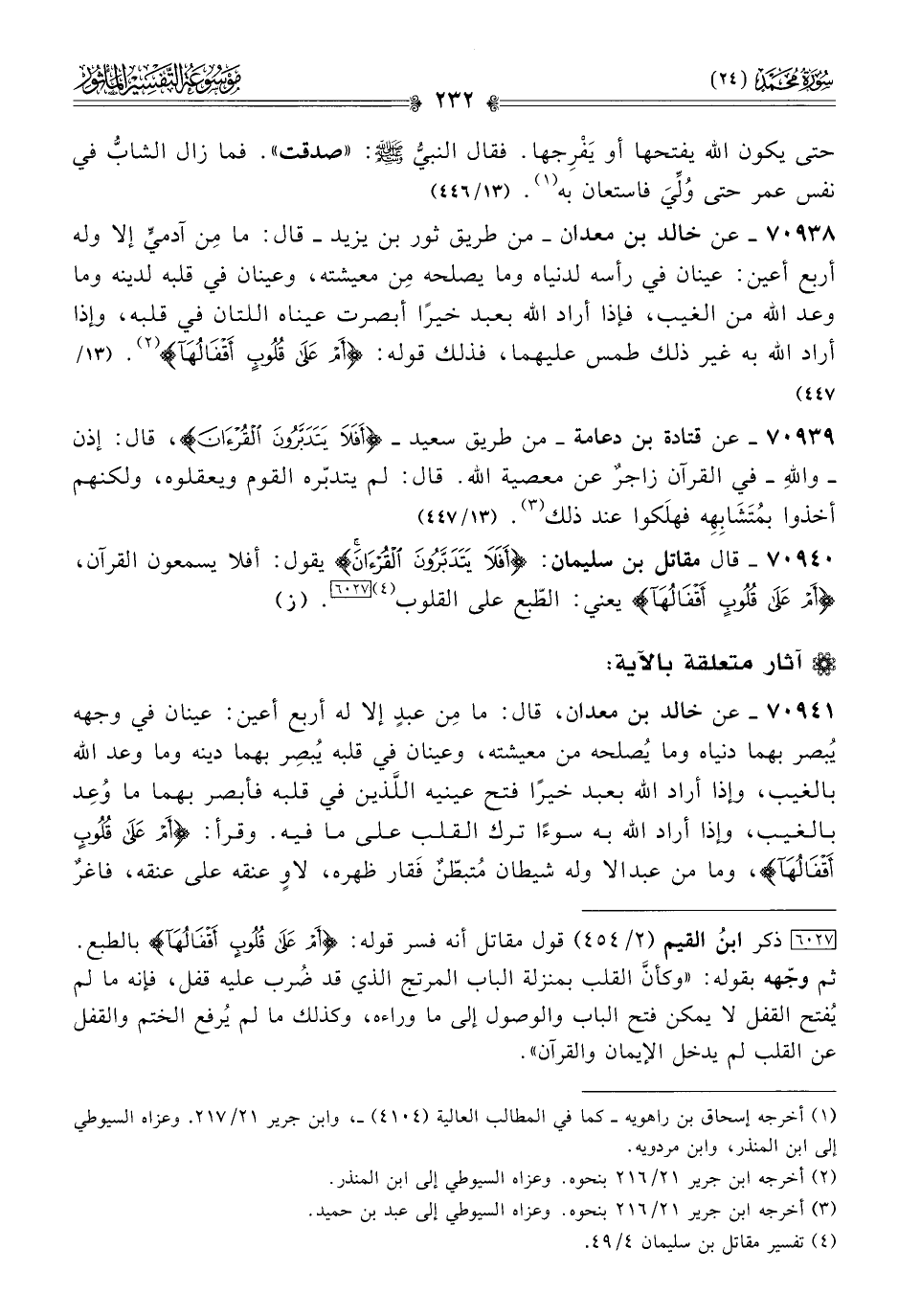 ٧٠٩٣٨ - عن خالد بن معدان -من طريق ثور بن يزيد- قال: ما مِن آدميٍّ إلا وله أربع أعين: عينان في رأسه لدنياه وما يصلحه مِن معيشته، وعينان في قلبه لدينه وما وعد الله من الغيب، فإذا أراد الله بعبد خيرًا أبصرت عيناه اللتان في قلبه، وإذا أراد الله به غير ذلك طمس عليهما، فذلك قوله: {أم على قلوب أقفالها} (¬٢). (١٣/ ٤٤٧)