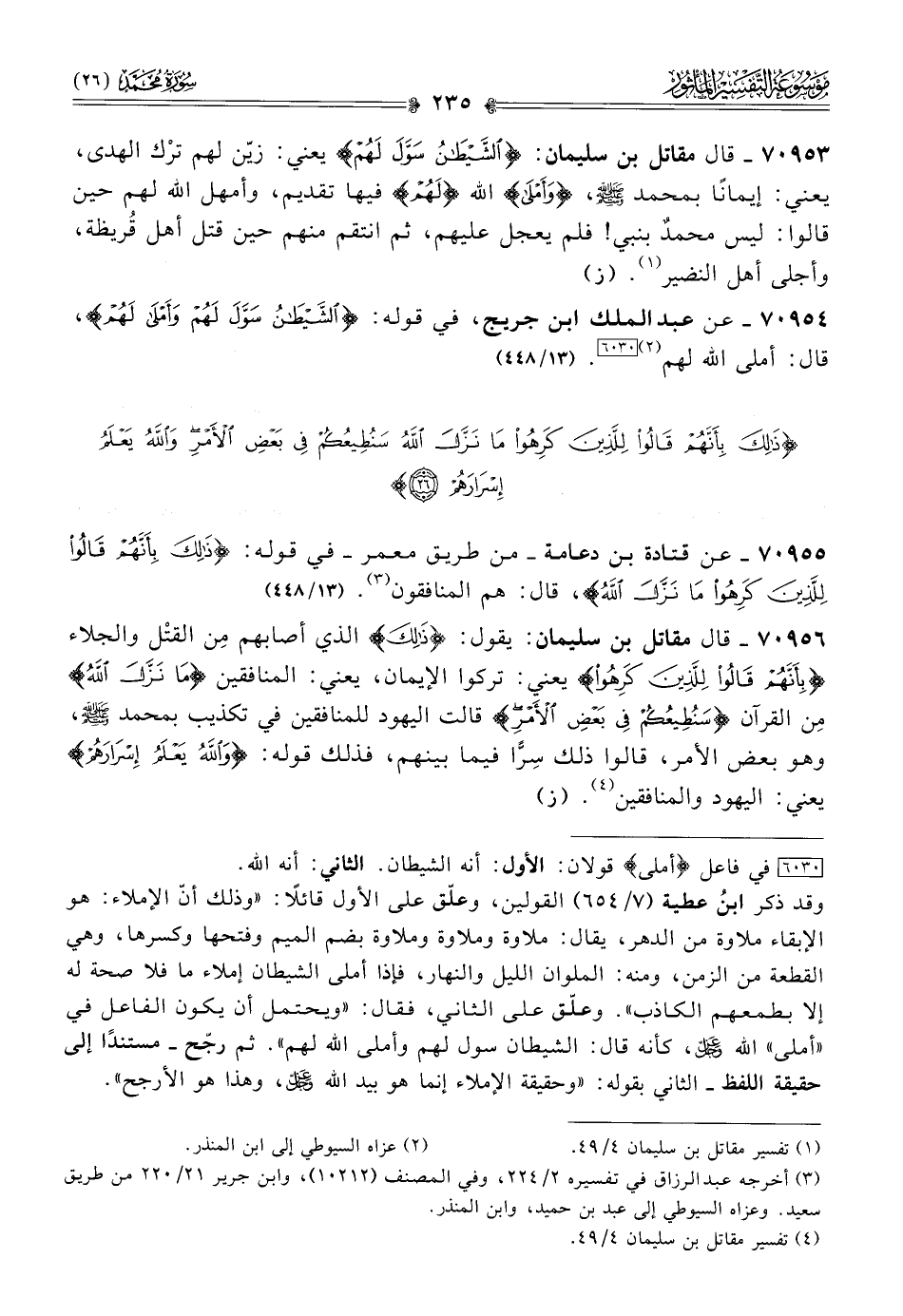 ٧٠٩٥٣ - قال مقاتل بن سليمان: {الشَّيْطانُ سَوَّلَ لَهُمْ} يعني: زيّن لهم ترْك الهدى، يعني: إيمانًا بمحمد - صلى الله عليه وسلم -، {وأَمْلى} الله {لَهُمُ} فيها تقديم، وأمهل الله لهم حين قالوا: ليس محمدٌ بنبي! فلم يعجل عليهم، ثم انتقم منهم حين قتل أهل قُريظة، وأجلى أهل النضير (¬١). (ز)
