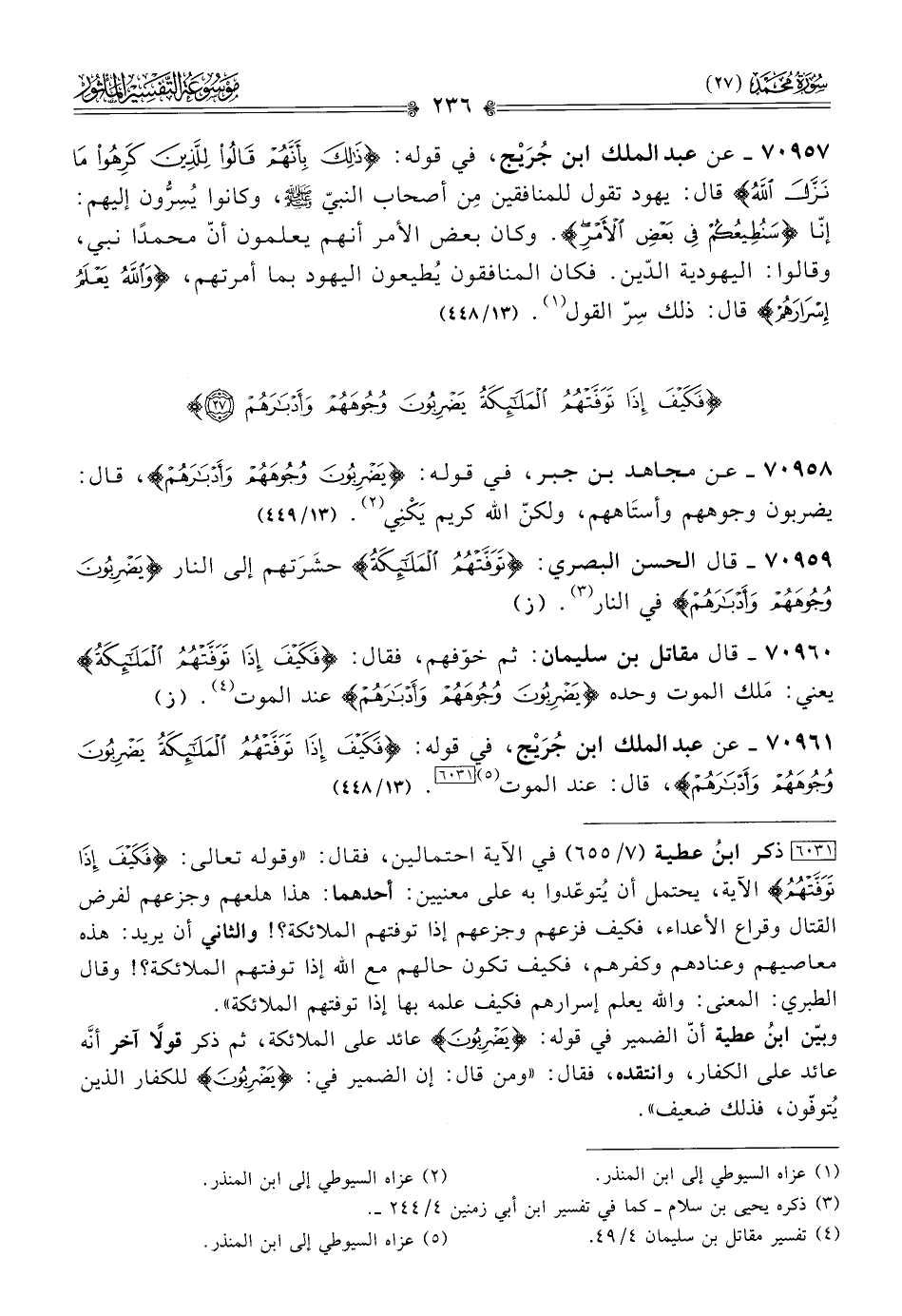 ٧٠٩٦١ - عن عبد الملك ابن جُرَيْج، في قوله: {فَكَيْفَ إذا تَوَفَّتْهُمُ المَلائِكَةُ يَضْرِبُونَ وُجُوهَهُمْ وأَدْبارَهُمْ}، قال: عند الموت (¬٥) [٦٠٣١]. (١٣/ ٤٤٨)