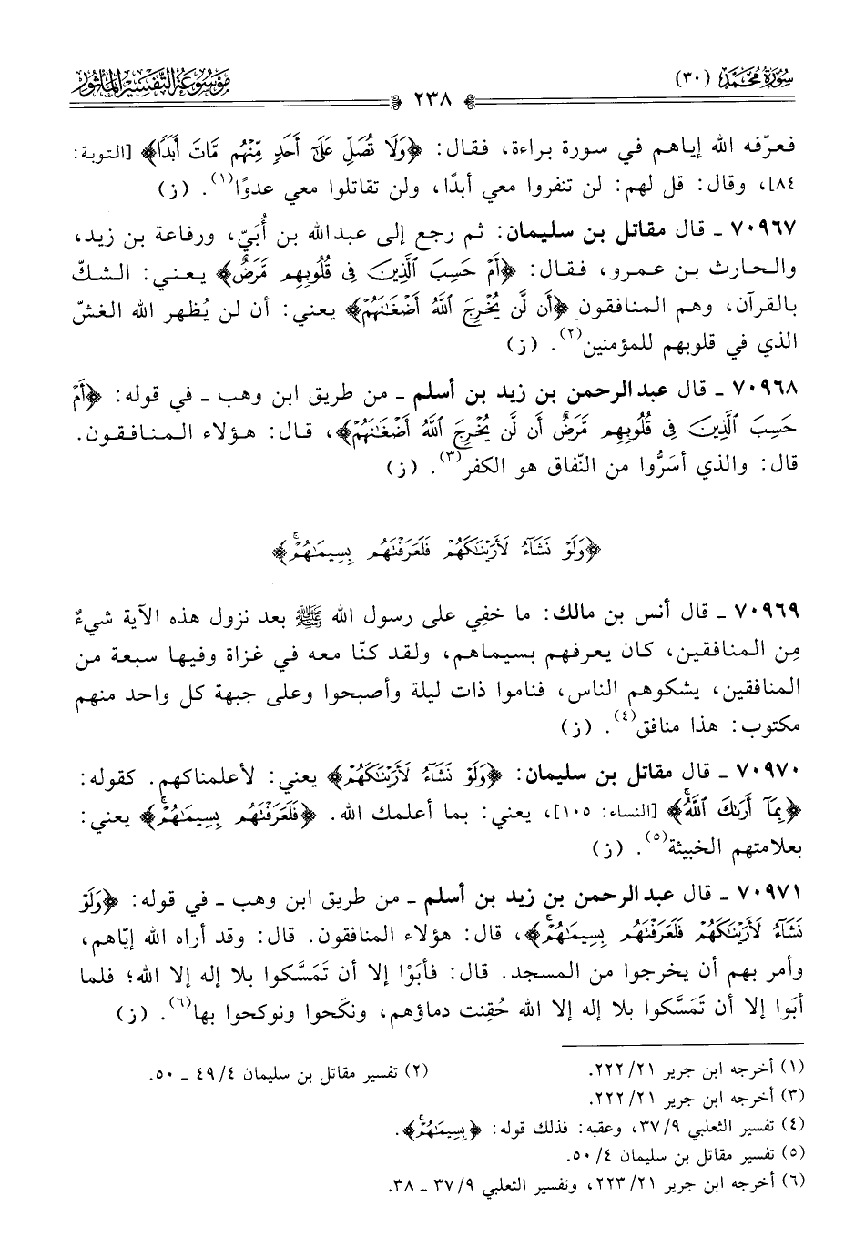 ٧٠٩٧١ - قال عبد الرحمن بن زيد بن أسلم -من طريق ابن وهب- في قوله: {ولَوْ نَشاءُ لَأَرَيْناكَهُمْ فَلَعَرَفْتَهُمْ بِسِيماهُمْ}، قال: هؤلاء المنافقون. قال: وقد أراه الله إيّاهم، وأمر بهم أن يخرجوا من المسجد. قال: فأبَوْا إلا أن تَمَسَّكوا بلا إله إلا الله؛ فلما أبَوا إلا أن تَمَسَّكوا بلا إله إلا الله حُقِنت دماؤهم، ونكَحوا ونوكحوا بها (¬٦). (ز)