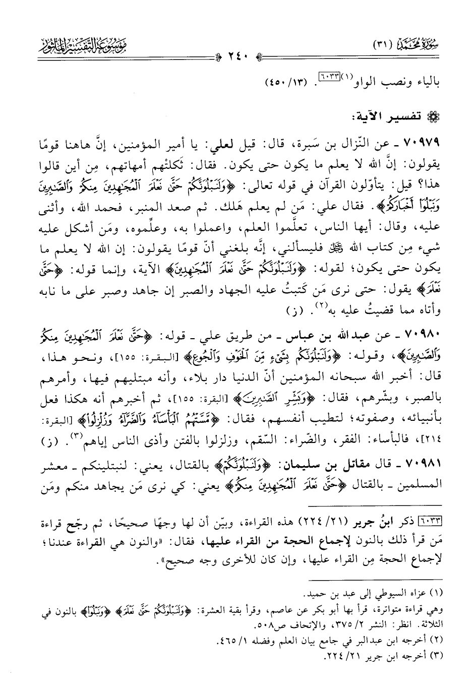 ٧٠٩٨٠ - عن عبد الله بن عباس -من طريق علي- قوله: {حَتّى نَعْلَمَ المُجاهِدِينَ مِنكُمْ والصّابِرِينَ}، وقوله: {ولَنَبْلُوَنَّكُمْ بِشَيْءٍ مِنَ الخَوْفِ والجُوعِ} [البقرة: ١٥٥]، ونحو هذا، قال: أخبر الله سبحانه المؤمنين أنّ الدنيا دار بلاء، وأنه مبتليهم فيها، وأمرهم بالصبر، وبشّرهم، فقال: {وبِشِّرِ الصّابِرِينَ} [البقرة: ١٥٥]، ثم أخبرهم أنه هكذا فعل بأنبيائه، وصفوته؛ لتطيب أنفسهم، فقال: {مَسَّتْهُمُ البَأْساءُ والضَّرّاءُ وزُلْزِلُوا} [البقرة: ٢١٤]، فالبأساء: الفقر، والضّراء: السّقم، وزلزلوا بالفتن وأذى الناس إياهم (¬٣). (ز)