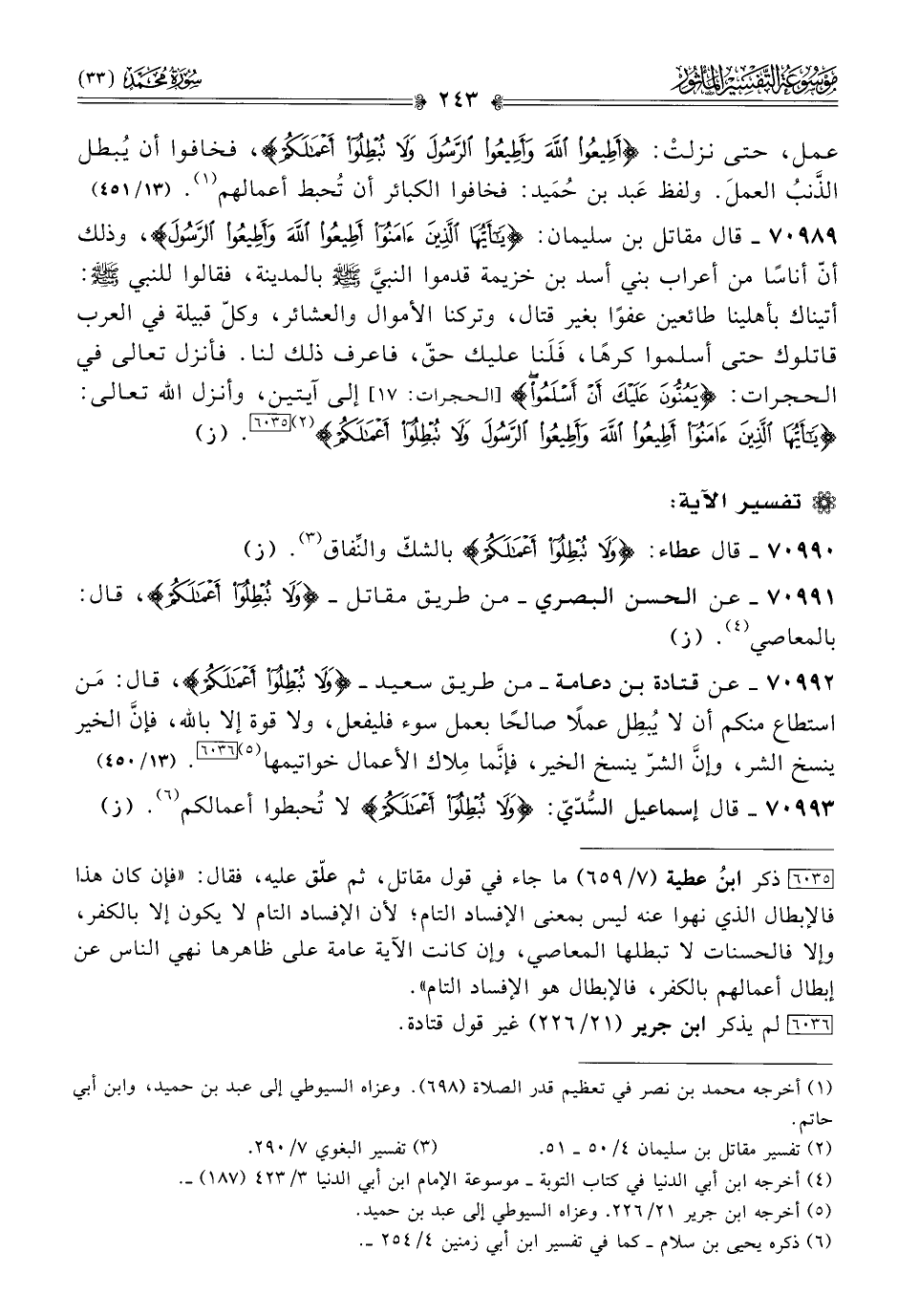٧٠٩٩٣ - قال إسماعيل السُّدّيّ: {ولا تُبْطِلُوا أعْمالَكُمْ} لا تُحبطوا أعمالكم (¬٦). (ز)