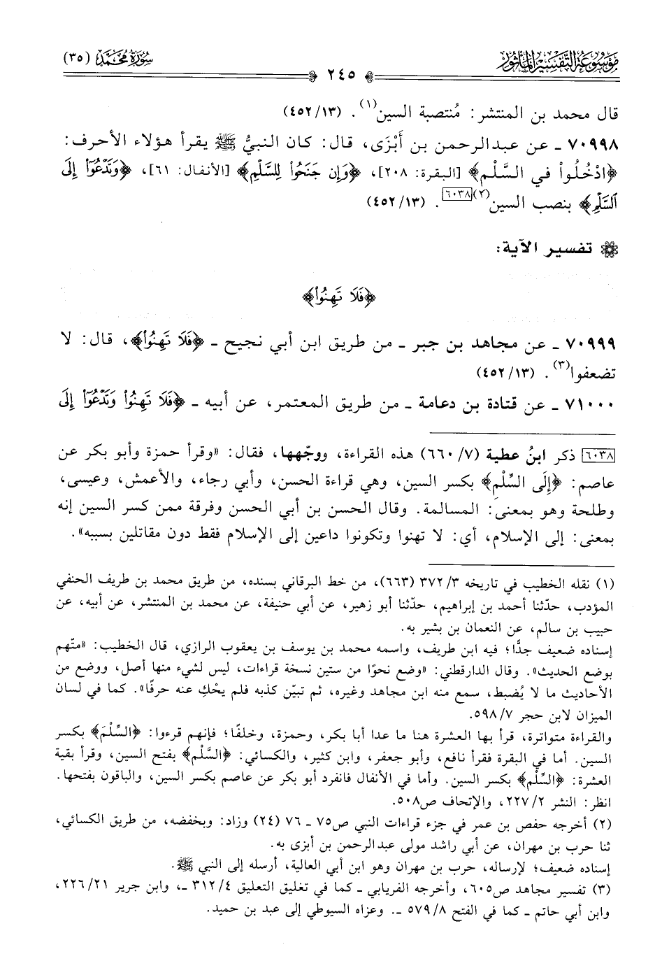 ٧١٠٠٠ - عن قتادة بن دعامة -من طريق المعتمر، عن أبيه- {فَلا تَهِنُوا وتَدْعُوا إلى