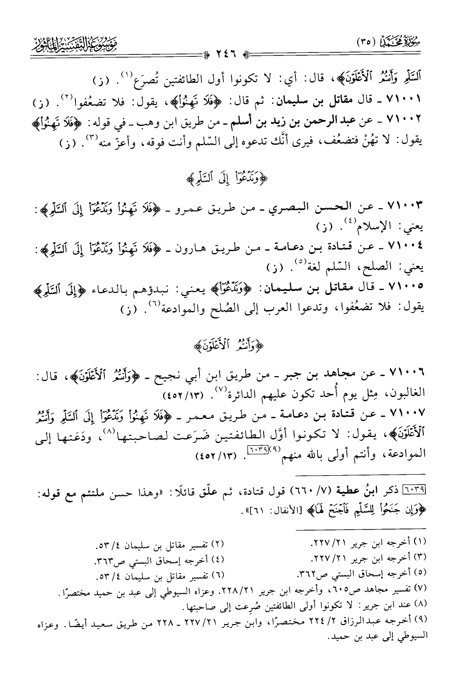 ٧١٠٠٧ - عن قتادة بن دعامة -من طريق معمر- {فَلا تَهِنُوا وتَدْعُوا إلى السَّلْمِ وأَنْتُمُ الأَعْلَوْنَ}، يقول: لا تكونوا أوَّل الطائفتين ضَرَعت لصاحبتها (¬٨)، ودَعَتها إلى الموادعة، وأنتم أولى بالله منهم (¬٩) [٦٠٣٩]. (١٣/ ٤٥٢)