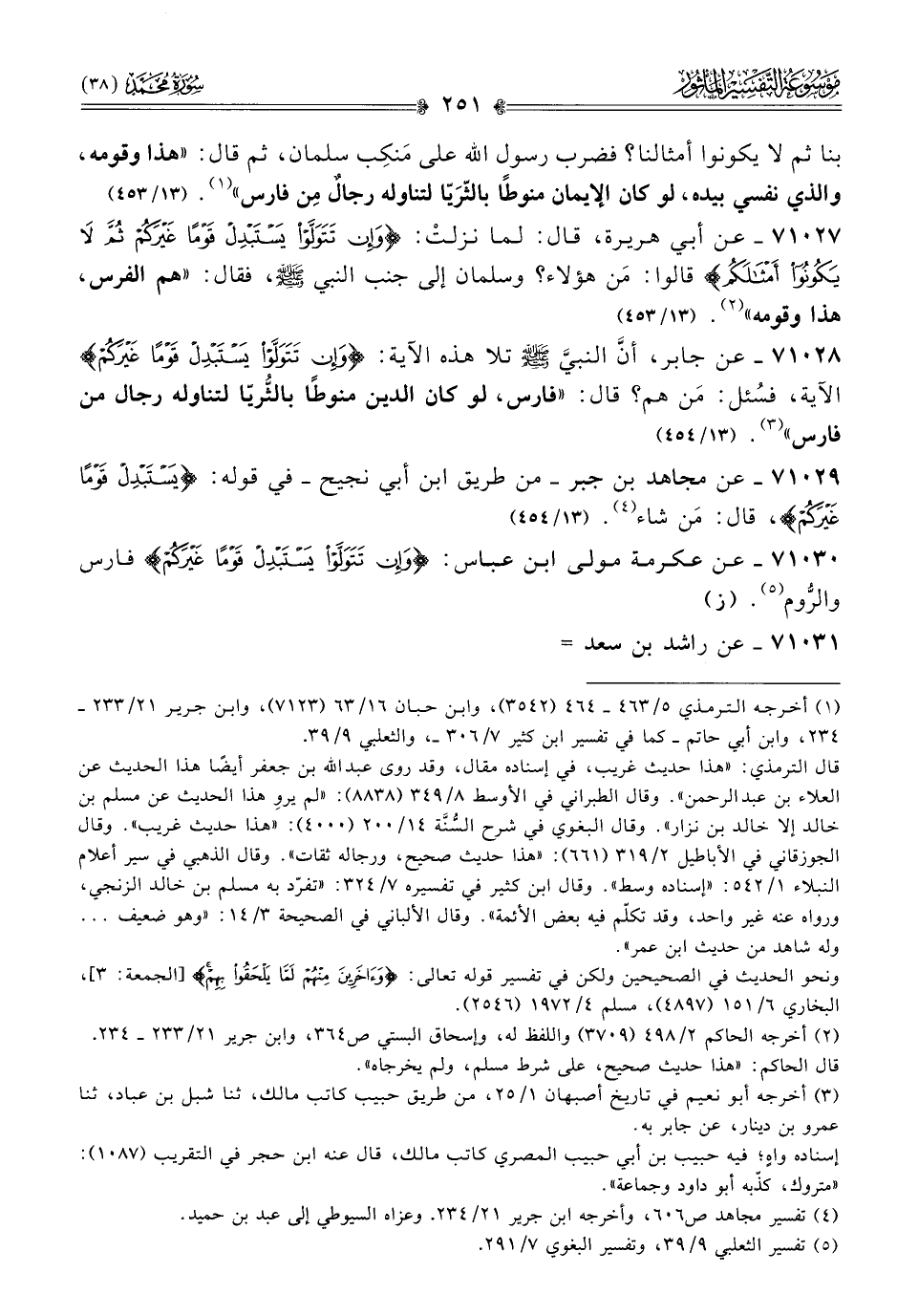 ٧١٠٢٨ - عن جابر، أنّ النبيَّ - صلى الله عليه وسلم - تلا هذه الآية: {وإنْ تَتَوَلَّوْا يَسْتَبْدِلْ قَوْمًا غَيْرَكُمْ ثُمَّ}، فسُئل: مَن هم؟ قال: «فارس، لو كان الدين منوطًا بالثُّريّا لتناوله رجال من فارس» (¬٣). (١٣/ ٤٥٤)