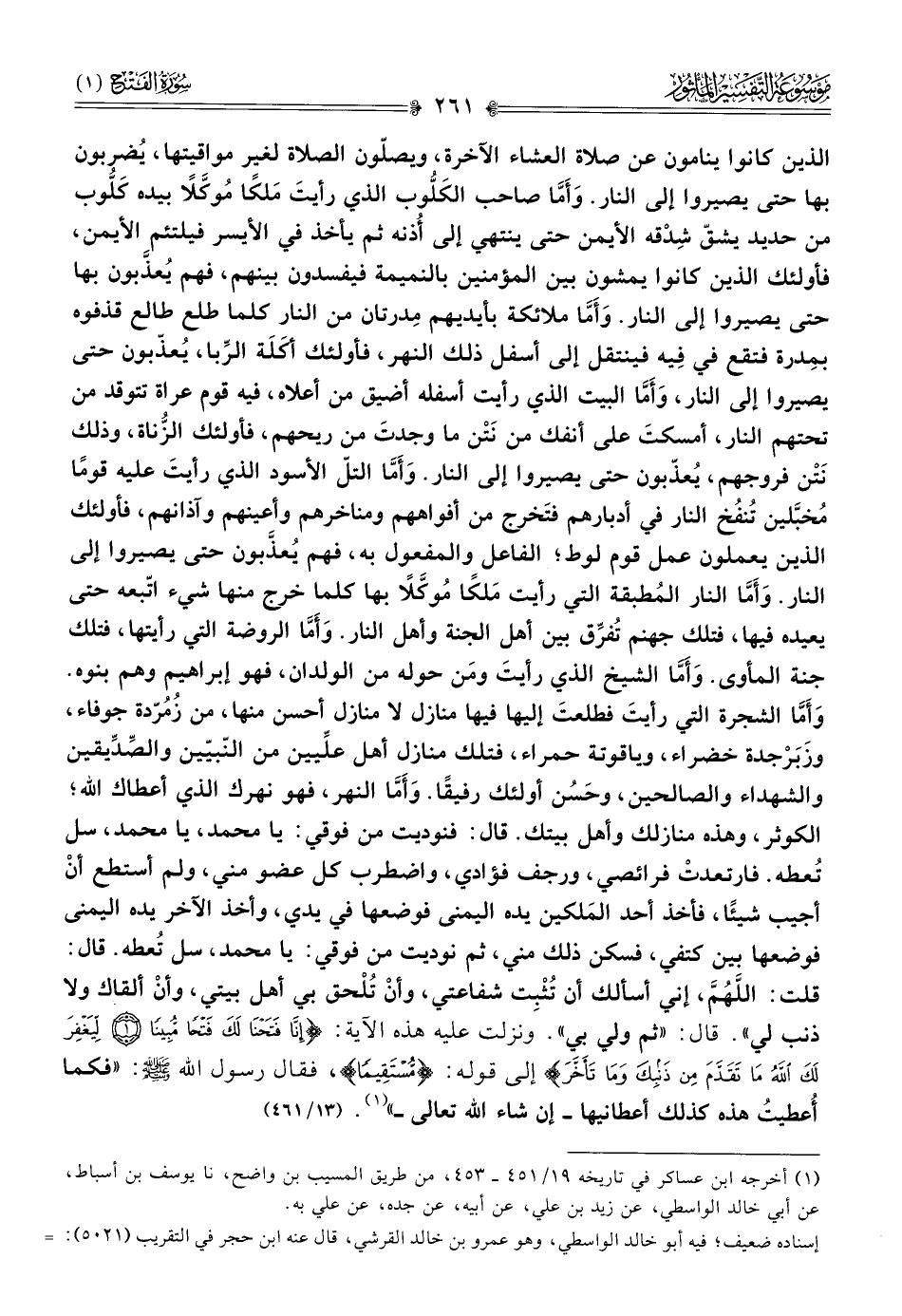 الذين كانوا ينامون عن صلاة العشاء الآخرة، ويصلّون الصلاة لغير مواقيتها، يُضربون بها حتى يصيروا إلى النار. وأَمّا صاحب الكَلُّوب الذي رأيتَ مَلكًا مُوكَّلًا بيده كَلُّوب من حديد يشقّ شِدْقه الأيمن حتى ينتهي إلى أُذنه ثم يأخذ في الأيسر فيلتئم الأيمن، فأولئك الذين كانوا يمشون بين المؤمنين بالنميمة فيفسدون بينهم، فهم يُعذَّبون بها حتى يصيروا إلى النار. وأَمّا ملائكة بأيديهم مِدرتان من النار كلما طلع طالع قذفوه بمِدرة فتقع في فِيه فينتقل إلى أسفل ذلك النهر، فأولئك أكَلَة الرِّبا، يُعذّبون حتى يصيروا إلى النار، وأَمّا البيت الذي رأيت أسفله أضيق من أعلاه، فيه قوم عراة تتوقد من تحتهم النار، أمسكتَ على أنفك من نَتْن ما وجدتَ من ريحهم، فأولئك الزُّناة، وذلك نَتْن فروجهم، يُعذّبون حتى يصيروا إلى النار. وأَمّا التلّ الأسود الذي رأيتَ عليه قومًا مُخبَّلين تُنفُخ النار في أدبارهم فتَخرج من أفواههم ومناخرهم وأعينهم وآذانهم، فأولئك الذين يعملون عمل قوم لوط؛ الفاعل والمفعول به، فهم يُعذَّبون حتى يصيروا إلى النار. وأَمّا النار المُطبقة التي رأيت مَلكًا مُوكَّلًا بها كلما خرج منها شيء اتّبعه حتى يعيده فيها، فتلك جهنم تُفرِّق بين أهل الجنة وأهل النار. وأَمّا الروضة التي رأيتها، فتلك جنة المأوى. وأَمّا الشيخ الذي رأيتَ ومَن حوله من الولدان، فهو إبراهيم وهم بنوه. وأَمّا الشجرة التي رأيتَ فطلعتَ إليها فيها منازل لا منازل أحسن منها، من زُمُرّدة جوفاء، وزَبَرْجدة خضراء، وياقوتة حمراء، فتلك منازل أهل علِّيين من النّبيّين والصِّدِّيقين والشهداء والصالحين، وحَسُن أولئك رفيقًا. وأَمّا النهر، فهو نهرك الذي أعطاك الله؛ الكوثر، وهذه منازلك وأهل بيتك. قال: فنوديت من فوقي: يا محمد، يا محمد، سل تُعطه. فارتعدتْ فرائصي، ورجف فؤادي، واضطرب كل عضو مني، ولم أستطع أنْ أجيب شيئًا، فأخذ أحد المَلكين يده اليمنى فوضعها في يدي، وأخذ الآخر يده اليمنى فوضعها بين كتفي، فسكن ذلك مني، ثم نوديت من فوقي: يا محمد، سل تُعطه. قال: قلت: اللهم، إني أسألك أن تُثْبِت شفاعتي، وأنْ تُلْحق بي أهل بيتي، وأنْ ألقاك ولا ذنب لي». قال: «ثم ولي بي». ونزلت عليه هذه الآية: {إنّا فَتَحْنا لَكَ فَتْحًا مُبِينًا لِيَغْفِرَ لَكَ اللَّهُ ما تَقَدَّمَ مِن ذَنْبِكَ وما تَأَخَّرَ} إلى قوله: {مُسْتَقِيمًا}، فقال رسول الله - صلى الله عليه وسلم -: «فكما أُعطيتُ هذه كذلك أعطانيها -إن شاء الله تعالى-» (¬١). (١٣/ ٤٦١)